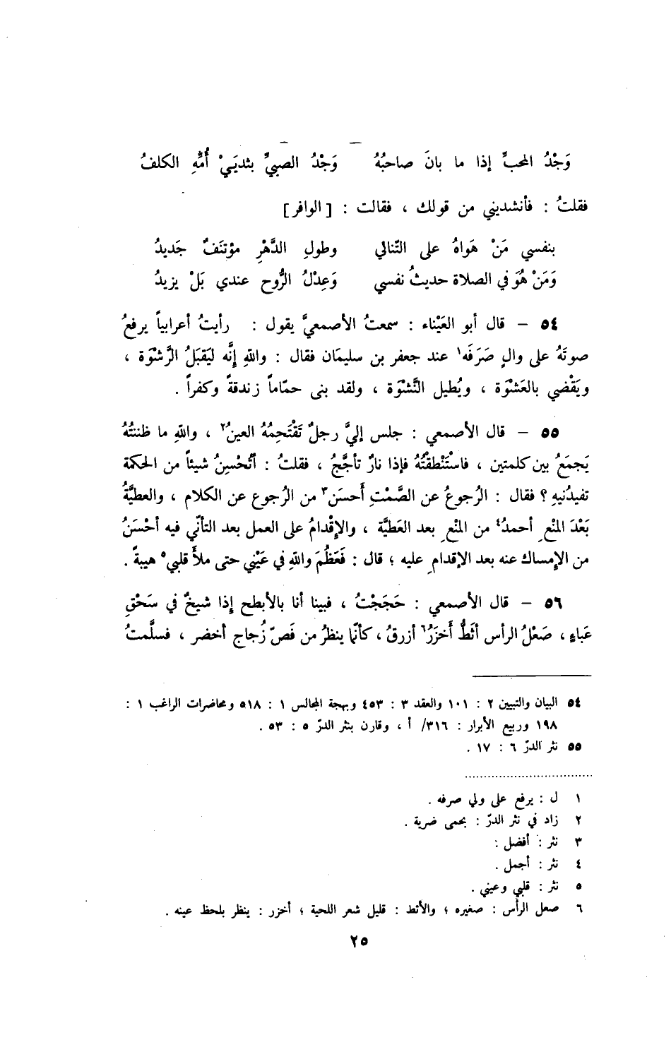 قال أبو العيناء: سمعت الأصمعي يقول: رأيت أعرابياً يرفع صوته على وال صرفه عند جعفر بن سليمان فقال: والله إنه ليقبل الرشوة، ويقضي بالعشوة، ويطيل النشوة، ولقد بنى حماماً زندقة وكفراً.