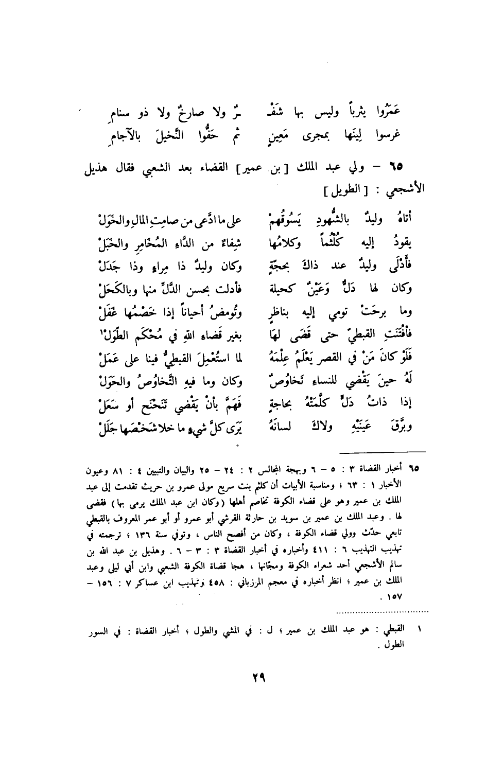 ولي عبد الملك بن عمير القضاء بعد الشعبي فقال هذيل الأشجعي: الطويل