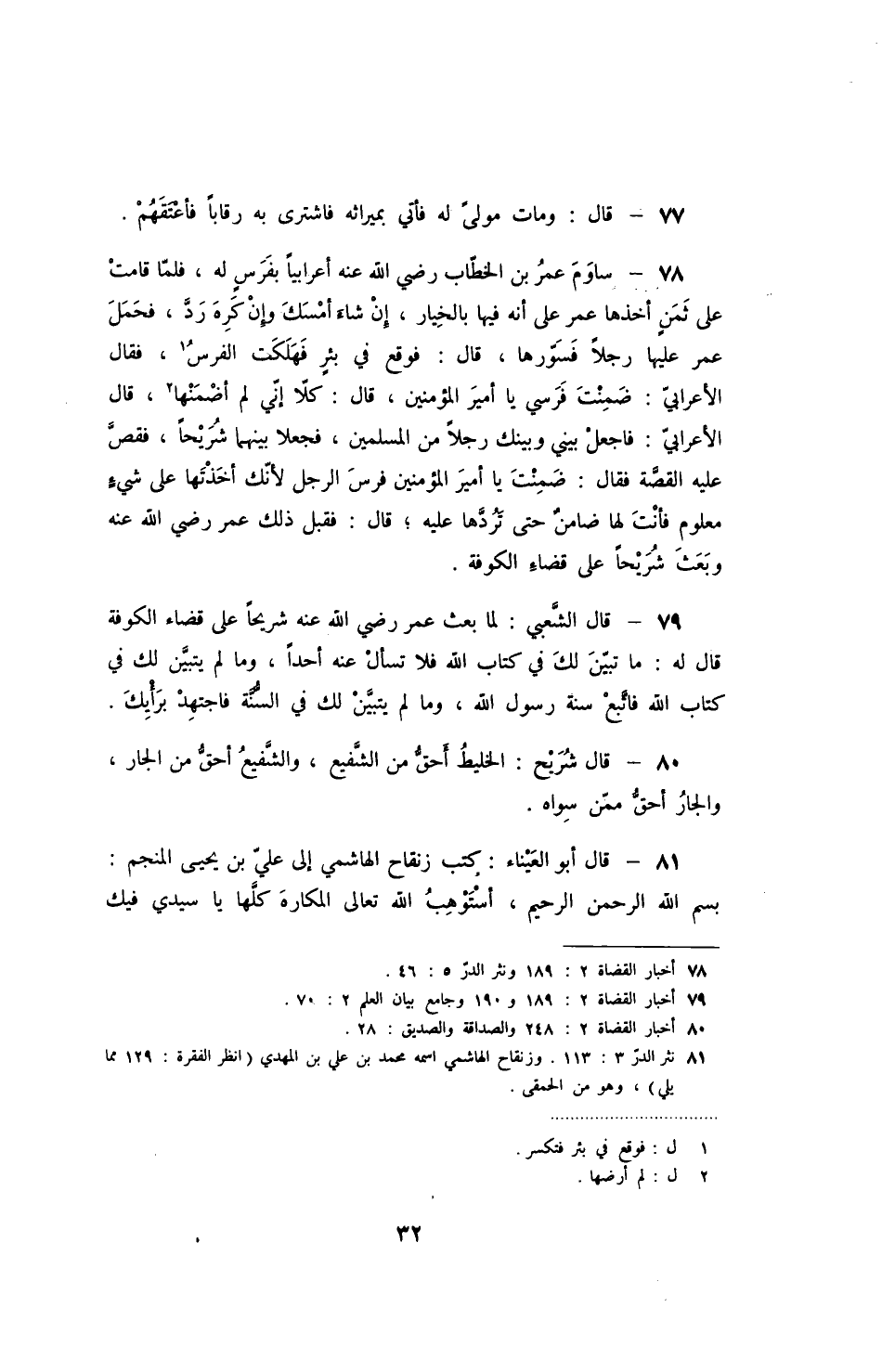 ساوم عمر بن الخطاب رضي الله عنه أعرابياً بفرس له، فلما قامت على ثمن أخذها عمر على أنه فيها بالخيار، إن شاء أمسك وإن كره رد، فحمل عمر عليها رجلاً فسورها، قال: فوقع في بئر فهلكت الفرس، فقال الأعرابي: ضمنت فرسي يا أمير المؤمنين قال: كلا إني لم أضمنها قال الأعرابي. فاجعل بيني وبينك رجلاً من المسلمين، فجعلا بينهما شريحاً، فقص عليه القصة فقال: ضمنت يا أمير المؤمنين فرس الرجل لأنك أخذتها على شيء معلوم فأنت لها ضامن حتى تردها عليه؛ قال: فقبل ذلك عمر رضي الله عنه وبعث شريحاً على قضاء الكوفة.