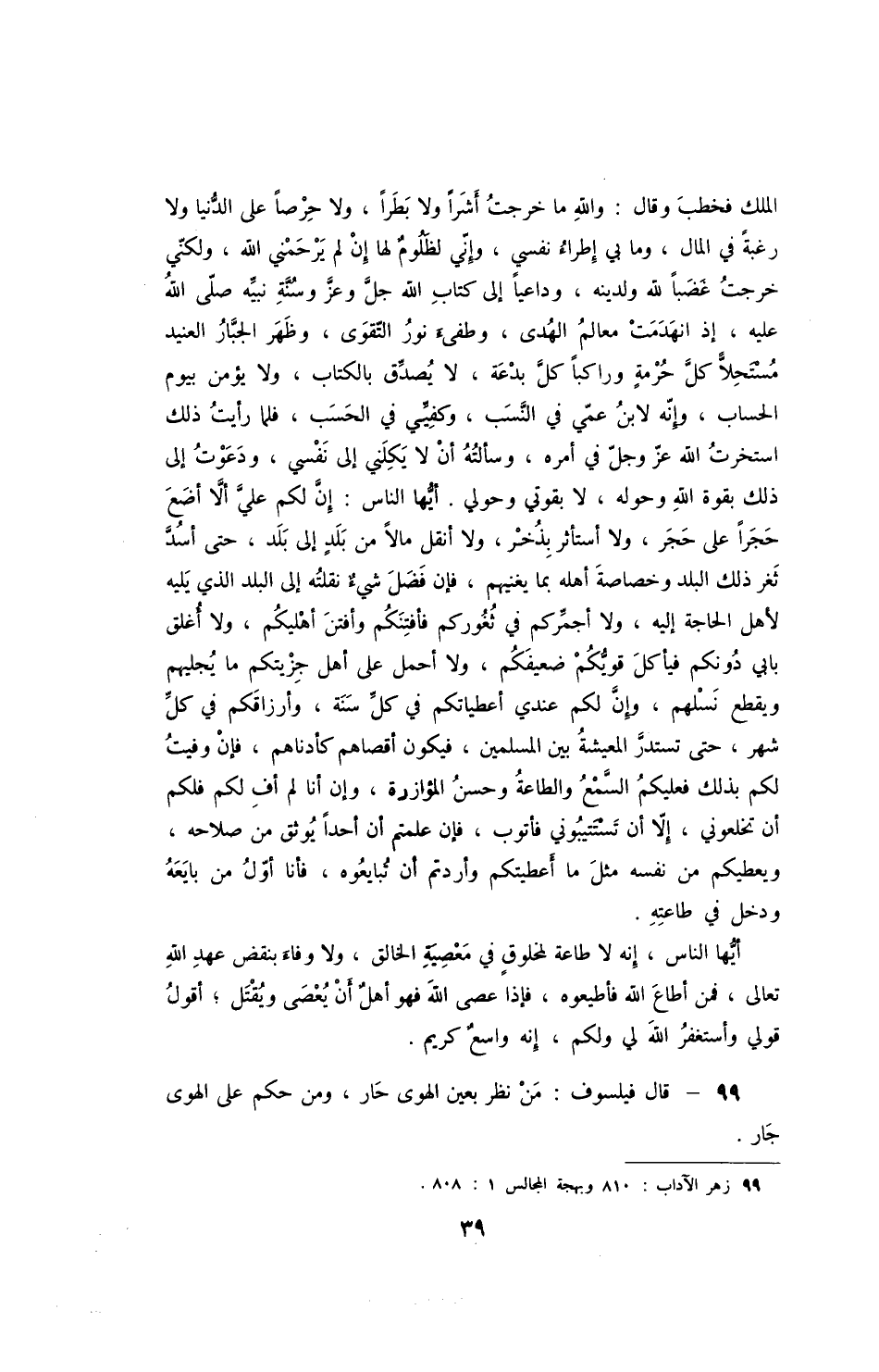 أيها الناس، إنه لا طاعة لخلوق في معصية الخالق، ولا وفاء بنقض عهد الله تعالى، فمن أطاع الله فأطيعوه، فإذا عصى الله فهو أهل أن يعصى ويقتل؛ أقول قولي وأستغفر الله لي ولكم، إنه واسع كريم.