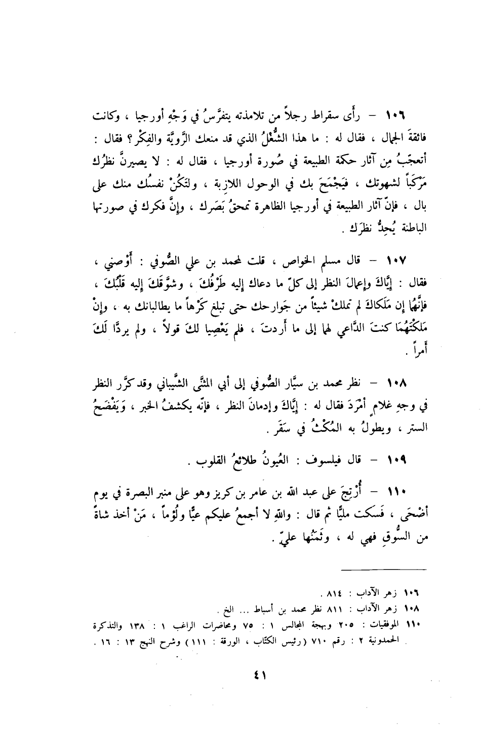 قال مسلم الخواص، قلت لمحمد بن علي الصوفي أوصني، فقال: إياك وإعمال النظر إلى كل ما دعاك إليه طرفك، وشوقك إليه قلبك، فإنهما إن ملكاك لم تملك شيئاً من جوارحك حتى تبلغ كرهاً ما يطالبانك به، وإن ملكتهما كنت الداعي لهما إلى ما أردت، فلم يعصيا لك قولاً، ولم يرداً لك أمراً.