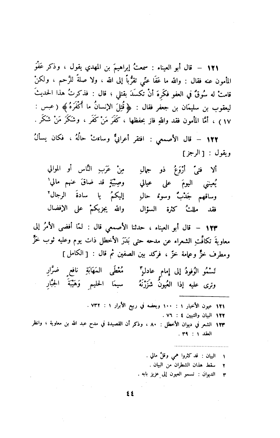 قال أبو العيناء، حدثنا الأصمعي قال: لما أفضى الأمر إلى معاوية تكافت الشعراء عن مدحه حتى بدر الأخطل ذات يوم وعليه ثوب خز ومطرف خز وعمامة خز، فركدبين الصفين ثم قال: الكامل
