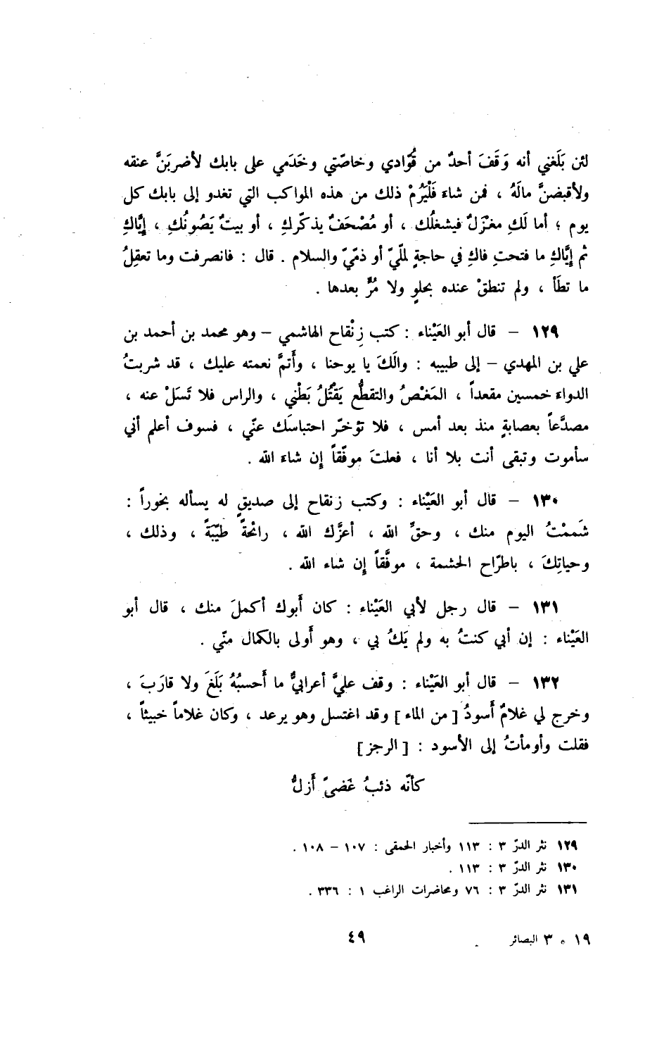 قال أبو العيناء: كتب زنقاح الهاشمي - وهو محمد بن أحمد بن علي بن المهدي - إلى طبيبه: والك يا يوحنا، وأتم نعمته عليك، قد شربت الدواء خمسين مقعداً، والمغص والتقطع يقتل بطني، والرأس فلا تسل عنه، مصدعاً بعصابة منذ بعد أمس، فلا تؤخر احتباسك عني، فسوف أعلم أني سأموت وتبقى أنت فلا أنا، فعلت موفقاً إن شاء الله.