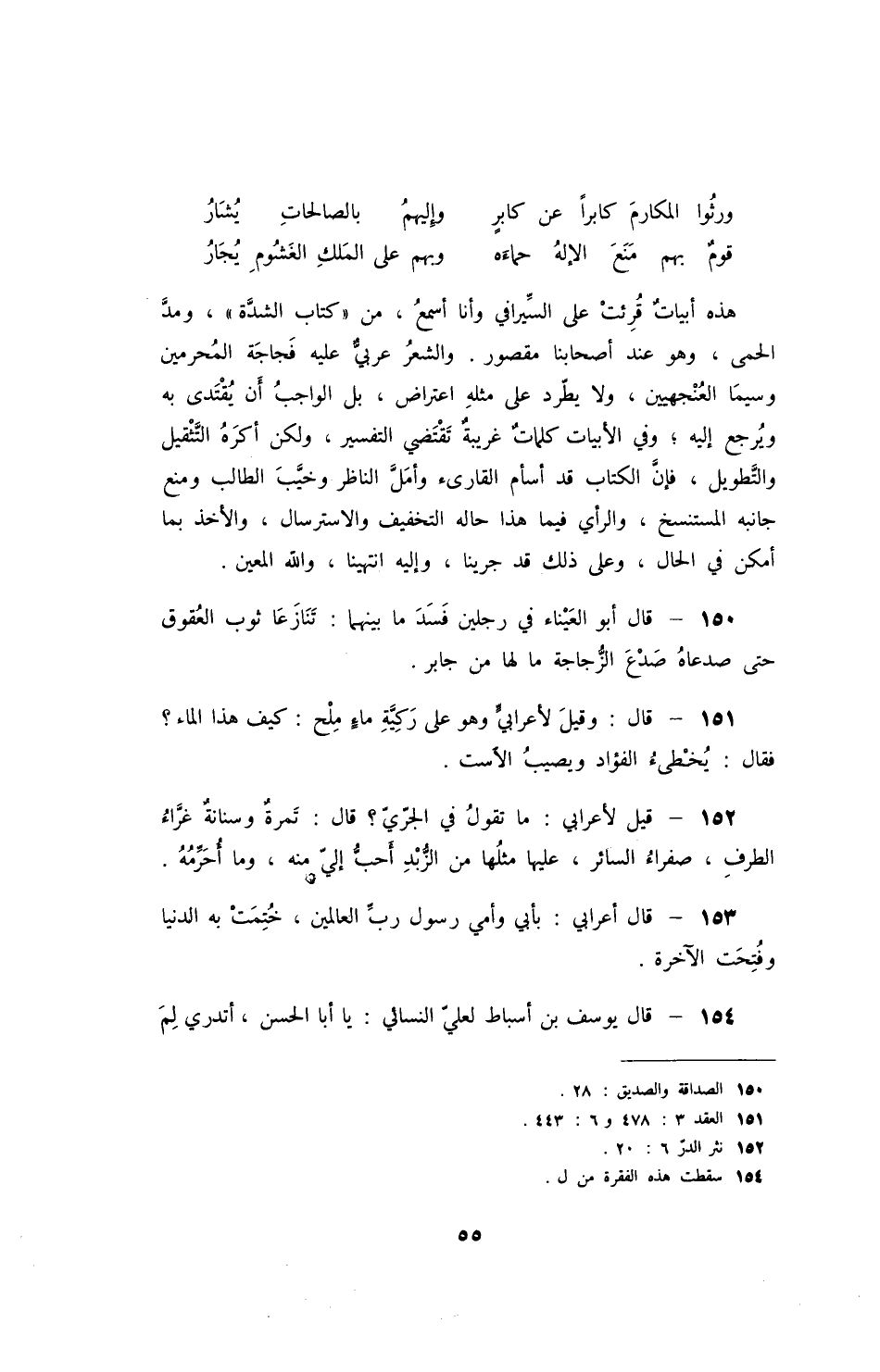 هذه أبيات قرئت على السيرافي وأنا أسمع، من كتاب الشدة، ومد الحمى، وهو عند أصحابنا مقصور، والشعر عربي عليه فجاجة المحرمين وسيما العنجهيين، ولا يطرد على مثله اعتراض، بل الواجب أن يقتدي به ويرجع إليه؛ وفي الأبيات كلمات غريبة تقتضي التفسير، ولكن أكره التثقيل والتطويل، فإن الكتاب قد أسأم القارئ وأمل الناظر وخيب الطالب ومنع جانبه المستنسخ، والرأي فيما هذا حاله التخفيف والاسترسال، والأخذ بما أمكن في الحال، وعلى ذلك قد جرينا، وإليه انتهينا، والله المعين.