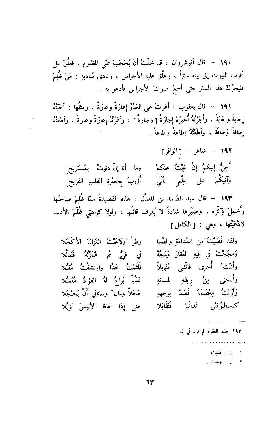 قال عبد الصمد بن المعذل: هذه القصيدة مما ظلم صاحبها وأخمل ذكره، وصيرها شاذة لا يعرف قائلها، ولولا كراهتي ظلم الأدب لادعيتها، وهي: الكامل