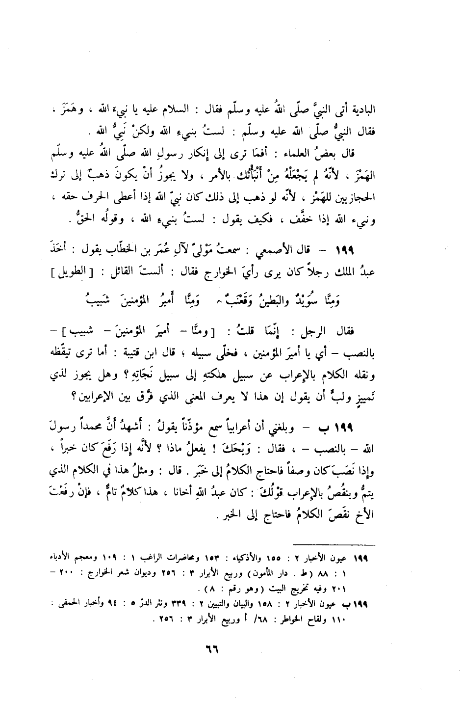 فقال الرجل: إنما قلت: ومنا - أمير المؤمنين - شبيب - بالنصب - أي يا أمير المؤمنين، فخلى سبيله؛ قال ابن قتيبة: أما ترى تيقظه ونقله الكلام بالإعراب عن سبيل هلكته إلى سبيل تجاته؟ وهل يجوز لذي تمييز ولب أن يقول إن هذا لا يعرف المعنى الذي فرق بين الإعرابين؟ وبلغني أن أعرابياً سمع مؤذناً يقول: أشهد أن محمداً رسول الله - بالنصب -، فقال: ويحك! يفعل ماذا؟ لأنه إذا رفع كان خبراً، وإذا نصب كان وصفاً فاحتاج الكلام إلى خبر، قال: ومثل هذا في الكلام الذي يتم وينقص بالإعراب قولك: كان عبد الله أخانا، هذا كلام تام، فإنك رفعت الأخ نقص الكلام فاحتاج إلى الخبر.