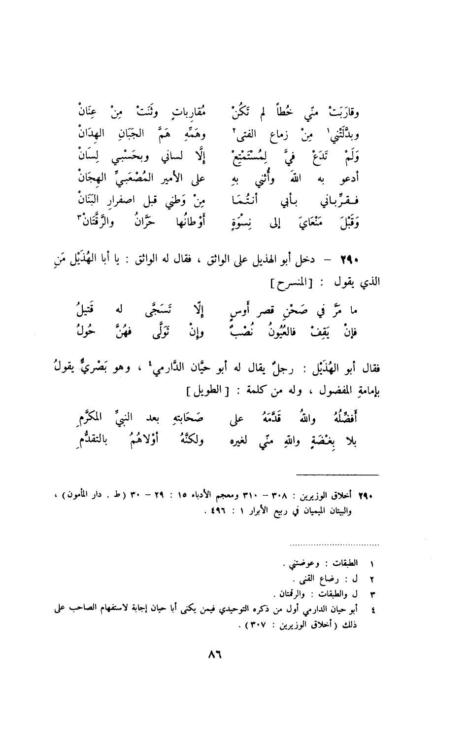 فقال أبو الهذيل: رجل يقال له أبو حيان الدرامي، وهو بصري يقول بإمامة المفضول، وله من كلمة: الطويل