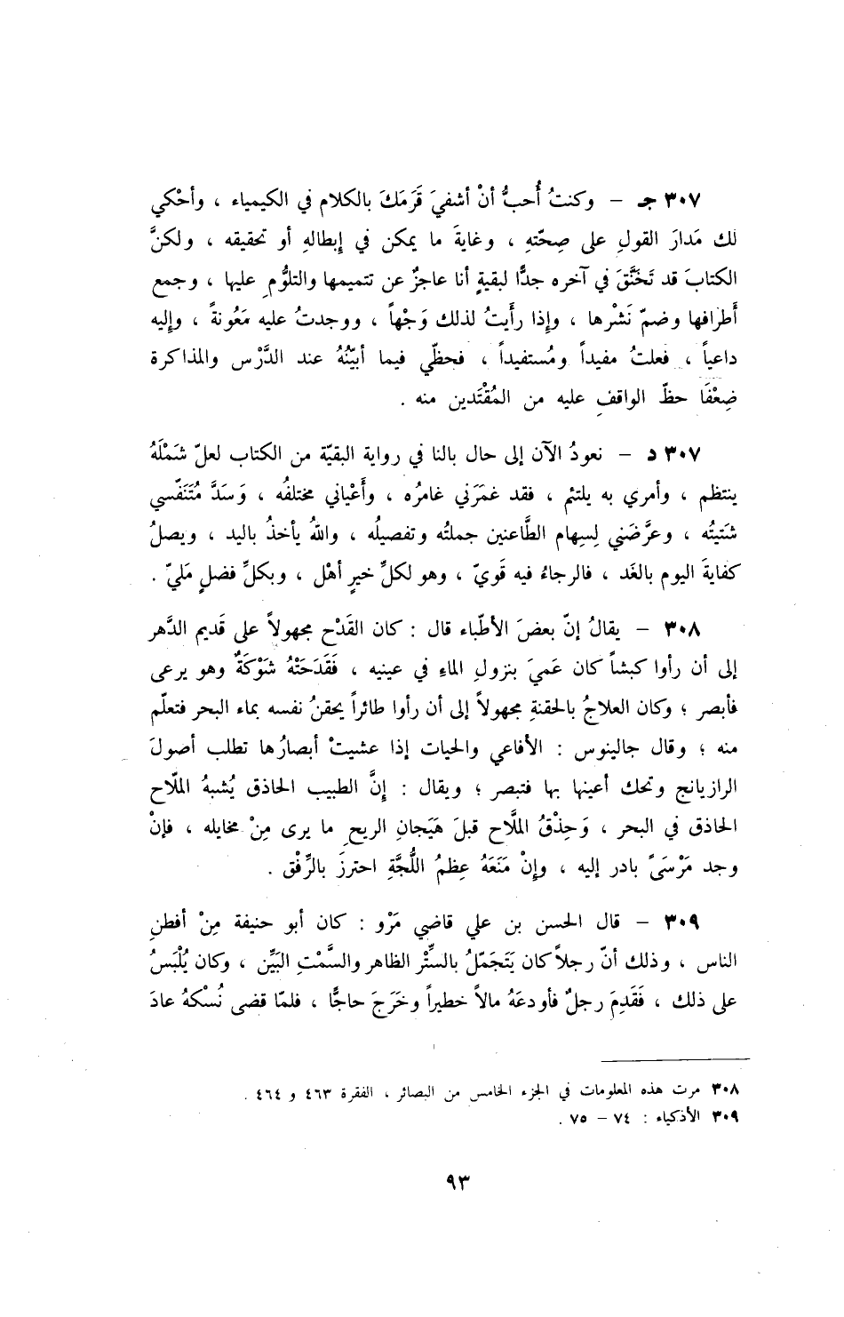 وكنت أحب أن أشفي قرمك بالكلام في الكيمياء، وأحكي لك مدار القول على صحته، وغاية ما يمكن في إبطاله أو تحقيقه، ولكن الكتاب قد تهنق في آخره جداً لبقية أنا عاجز عن تتميمها والتلوم عليها، وجمع أطرافها وضم نشرها، وإذا رأيت لذلك وجهاً، ووجدت عليه معونة، وإليه داعياً، فعلت مفيداً ومستفيداً، فحظي فيما أبينه عند الدرس المذاكرة ضعفاً حظ الواقف عليه من المقتدين منه.