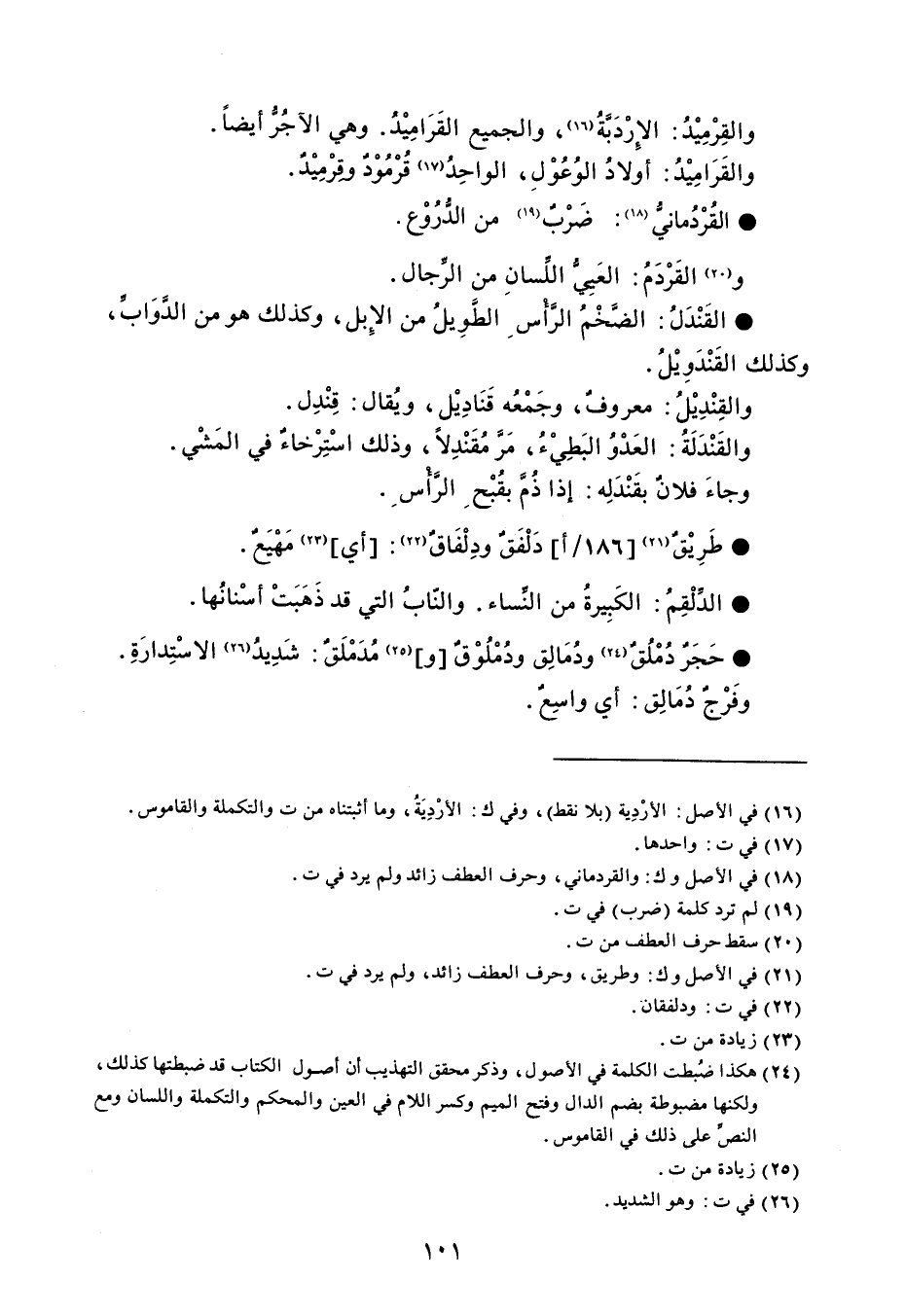 والقِرْمِيْدُ : الإِرْدَبَّةُ ، والجميع القَرَامِيْدُ . وهي الآجُرُّ أيضاً . والقَرَامِيْدُ : أولادُ الوُعُوْلِ ، الواحِدُ قُرْمُوْدٌ وقِرْمِيْدٌ . القُرْدُمانيُّ ضَرْبٌ من الدُّرُوْع . والقَرْدَمُ : العَيِيُّ اللِّسانِ من الرِّجال . القَنْدَلُ الضَّخْمُ الرَّأْس الطَوِيلُ من الإِبل ، وكذلك هو من الدَّوَابِّ ، وكذلك القَنْدَوِيْلُ . والقِنْدِيْلُ : معروفٌ ، وجَمْعُه قَنَادِيْل ، ويُقال : قِنْدِل . والقَنْدَلَةُ : العَدْوُ البَطِيْءُ ، مَرَّ مُقَنْدِلاً ، وذلك اسْتِرْخاءٌ في المَشْي . وجاءَ فلانٌ بقَنْدَلِه : إذا ذُمَّ بقُبْحِ الرّأْسِ . طَرِيْقٌ دَلْفَقٌ ودِلْفَاقٌ أي مَهْيَعٌ . الدَّلْقِمُ الكَبِيرةُ من النَساء . والنّابُ التي قد ذَهَبَتْ أسْنانُها . حَجَرٌ دُمْلُقٌ ودُمَالِق ودُمْلُوْقٌ ومُدَمْلَقٌ شَدِيدُ الاسْتِدارَةِ . وفَرْجٌ دُمَالِق أي واسِعٌ .