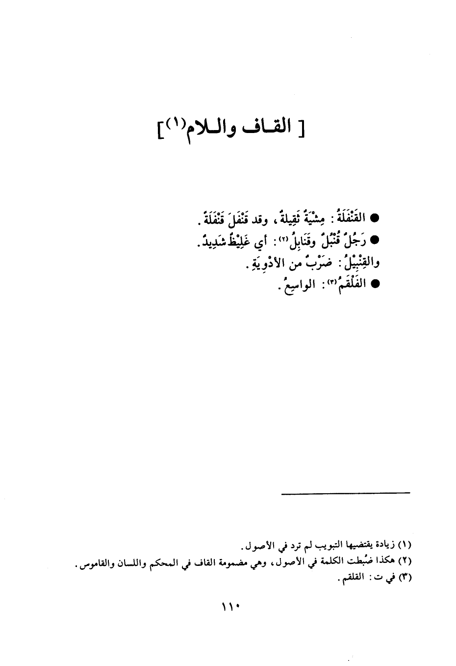 القَنْفَلَةُ مِشْيَةُ ثَقِيلة ، وقد قَنْفَلَ قَنْفَلَةً . رَجُلٌ قُنْبُلٌ وقَنَابِلُ أي غَلِيْظٌ شَدِيدٌ . والقِنْبِيْلُ : ضَرْبٌ من الأدْوِيَةِ . الفَلْقَمُ الواسِعُ .