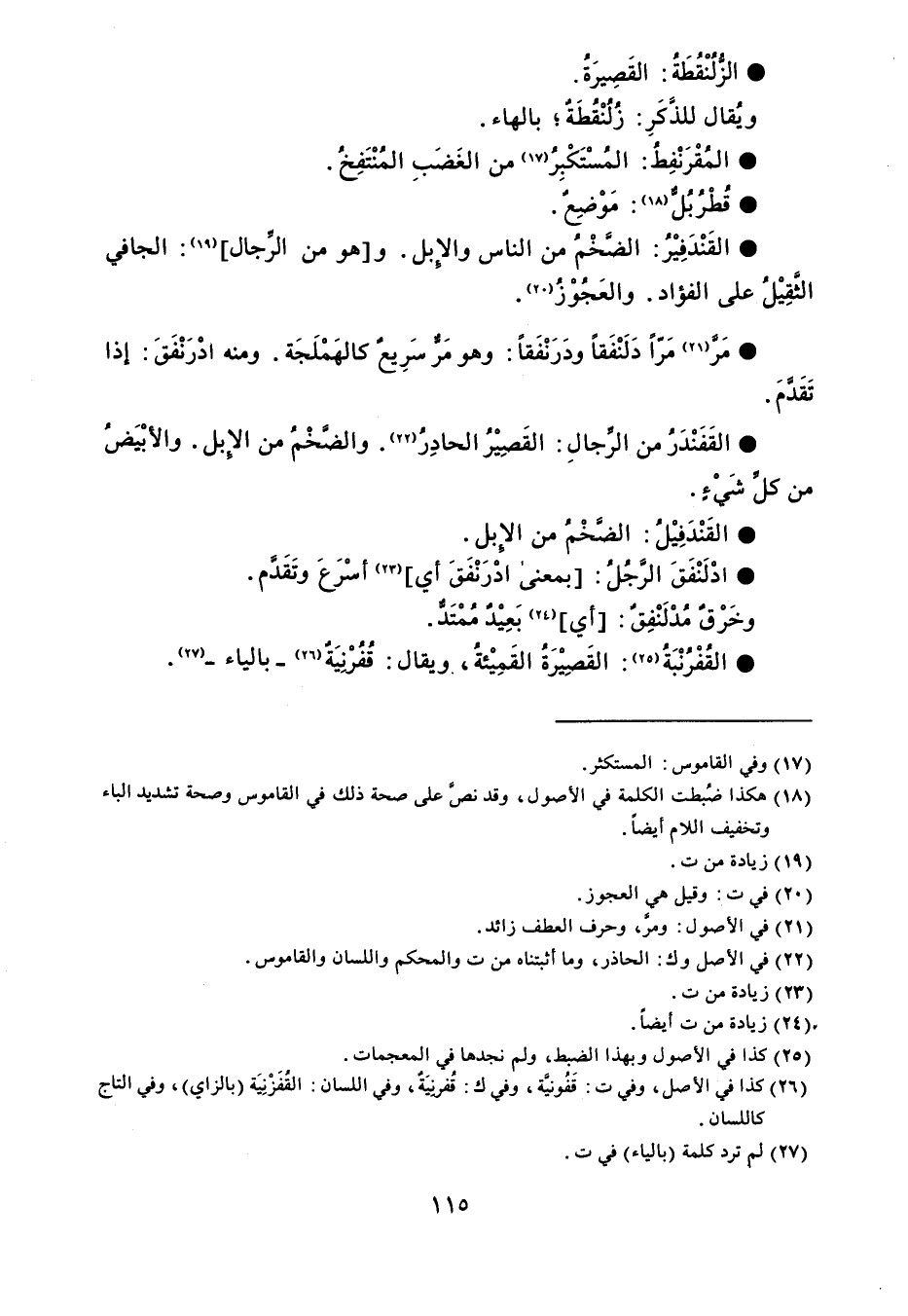 الزُلُنْقُطَةُ القَصِيرَةُ . ويُقال للذَّكَرِ : زُلُنْقُطَةٌ بالهاء . المُقْرَنْفِطُ المُسْتَكْبِرُ من الغَضَبِ المُنْتَفِخُ . قُطْرُبُلٌّ مَوْضِعٌ . القَنْدَفِيْرُ الضَّخْمُ من الناس والإِبل . وهو من الرِّجال الجافي الثقِيْلُ على الفؤاد . والعَجُوْزُ . مَرَّ مَرّاً دَلَنْفَقاً ودَرَنْفَقاً وهو مَر سَرِيعٌ كالهَمْلَجَة . ومنه ادْرَنْفَقَ إذا تَقدَّمَ . القَفَنْدَرُ من الرِّجالِ القَصِيْرُ الحادِرُ . والضَّخْمُ من الإبل . والأبْيَضُ من كل شَيْءٍ . القَنْدَفِيْلُ الضَّخْمُ من الإِبل . ادْلَنْفَقَ الرجُلُ بمعنى ادْرَنْفَقَ أي ، أسْرَعَ وتَقَدَّم . وخَرْقٌ مُدْلَنْفِقٌ : أي ، بَعِيْدٌ مُمْتَدٌّ . القُفْرُنْبَةُ القَصِيْرَةُ القَمِيْئة ، ويقال قُفُرْنيَةٌ - بالياء - .