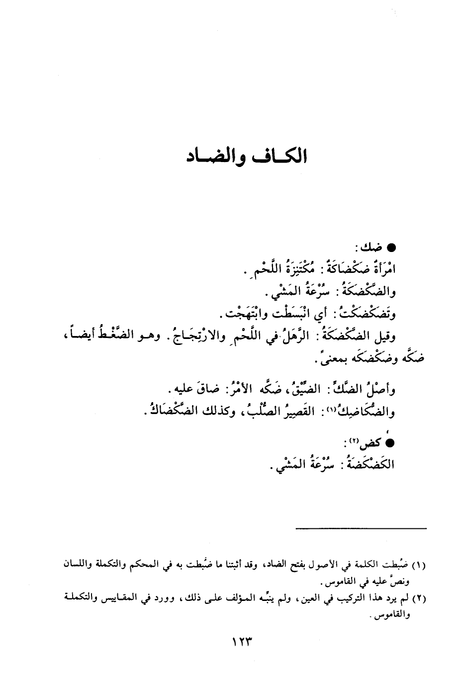 ضك امْرَأة ضَكْضَاكَةٌ : مُكْتَنِزَةُ اللَّحْم . والضَكْضَكَةُ : سُرْعَةُ المَشْي . وتَضَكْضَكْتُ : أي انْبَسَطْت وابْتَهَجْت . وقيل الضَكْضَكَةُ : الرَّهَلُ في اللَّحْم والارْتِجَاجُ . وهو الضَّغْطُ أيضاً ، ضَكَّه وضَكْضَكَه بمعنىً . وأصْلُ الضَّكِّ : الضِّيْقُ ، ضَكَه الأمْرُ : ضاقَ عليه . والضُكَاضِكُ : القَصِيرُ الصُّلْبُ ، وكذلك الضَكْضَاكُ . كض الكَضْكَضَةُ : سُرْعَةُ المَشْي .