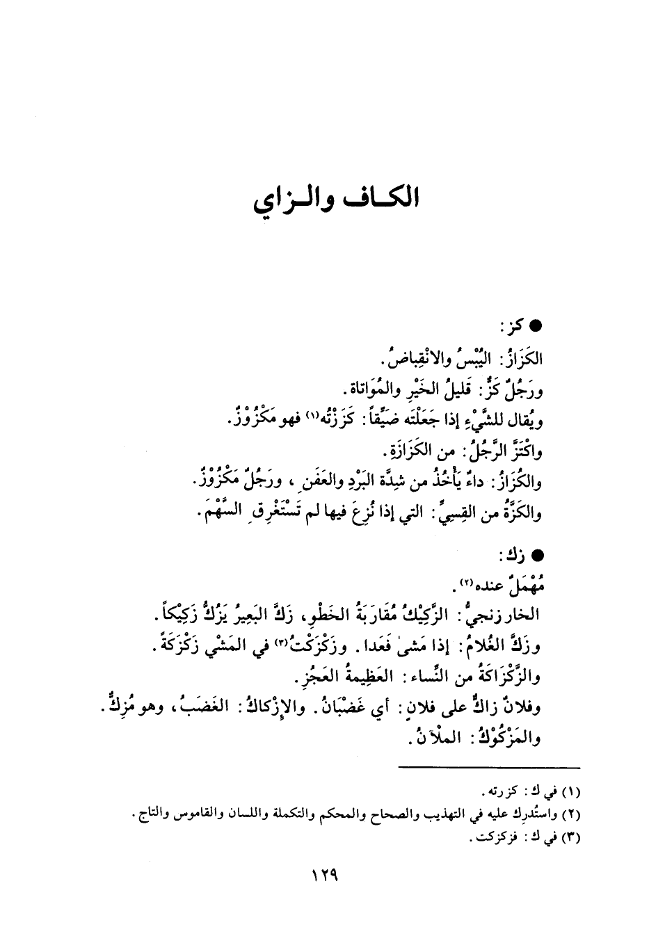 كز الكَزَازُ : اليُبْسُ والانْقِباضُ . ورَجُلٌ كَزٌ : قَليلُ الخَيْرِ والمُوَاتاة . ويُقال للشَيْءِ إذا جَعَلْتَه ضَيقاً : كَزَزْتُه فهو مَكْزُوْزٌ . واكْتَزَّ الرجُلُ : من الكَزَازة . والكُزَازُ : داءٌ يَأخُذُ من شِدَّة البَرْدِ والعَفَن ، ورَجُلٌ مَكْزُوْزٌ . والكَزُّة من القِسِيِّ : التي إذا نُزِعَ فيها لم تَسْتَغْرِق السَّهْمَ . زك مُهْمَلٌ عنده . الخارزنجيُّ : الركِيْكُ مُقَارَبَةُ الخَطْوِ ، زَك البَعِيرُ يَزُك زَكِيْكاً . وزَكَّ الغُلامُ : إذا مَشى فَعَدا . وزَكْزَكْتُ في المَشْي زَكْزَكَةً . والزَّكْزَاكَةً من النِّساء : العَظِيمةُ العَجُزِ . وفلانٌ زاك على فلانٍ : أي غَضْبَان . والإِزْكاكُ : الغَضَبُ ، وهو مُزِكٌّ . والمَزْكُوْكُ : الملآنُ .