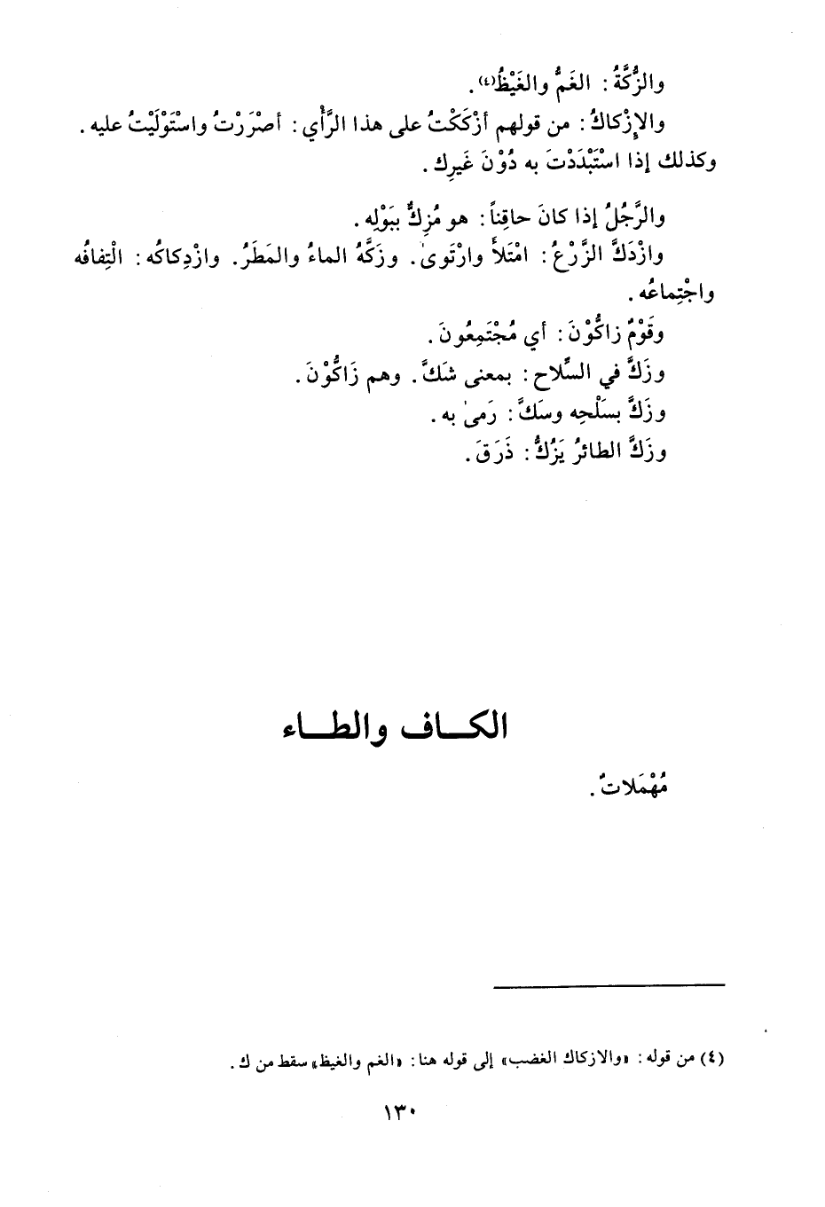 والزُّكَّةُ : الغَمُ والغَيْظُ . والإِزْكاكُ : من قولهم أزْكَكْتُ على هذا الرَّأي : أصْرَرْتُ واسْتَوْلَيْتُ عليه . وكذلك إذا اسْتَبْدَدْتَ به دُوْنَ غَيرِك . والرَّجُلُ إذا كانَ حاقِناً : هو مُزِكٌّ ببَوْله . وازْدَك الزَّرْعُ : امْتَلأ وارْتَوى . وزَكَّهُ الماءُ والمَطَرُ . وازْدِكاكُه : التِفاته واجْتِماعُه . وقَوْمٌ زاكُّوْنَ : أي مُجْتَمِعُونَ . وزَكَّ في السِّلاح : بمعنى شَكَّ . وهم زَاكُّونَ . وزَكَّ بسَلْحِه وسَكَّ : رَمى به . وزَكَّ الطائرُ يَزُكُّ : ذَرَقَ .