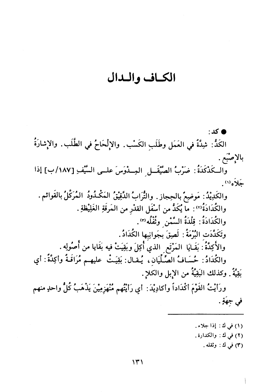 كد الكَدُّ : شِدَّة في العَمَل وطَلَبِ الكَسْب . والإِلْحَاحُ في الطلَب . والإِشارَةُ بالإِصْبَع . والكَدْكَدَةُ : ضَرْبُ الصَّيْقَل المِدْوَسَ على السَّيْفِ إذا جَلاَه . والكَدِيْدُ : مَوضِعٌ بالحِجاز . والتُّرَابُ الدَّقِيْقُ المَكْدُودُ المُرَكَّلُ بالقَوائم . والكُدَادَةُ : ما يُكَدُ من أسْفَل القدْرِ من المَرقَةِ الغَلِيْظةِ . والكُدَادَةُ : قِلْدَةُ السَّمْن وثُفْلُه . وتَكَدَّدَتِ البُرْمَةُ : لَصِقَ بجَوانِبِها الكُدَادُ . والأكِدَّةُ : بَقَايَا المَرْتَع الذي أُكِلَ وبَقِيَتْ فيه بَقَايا من أُصُوله . والكُدَادُ : حُسَافُ الصَّلِّيَانِ ، يُقال : بَقِيَتْ عليهم مُرَاقَةٌ وأكِدَّة : أي بَقِيةٌ . وكذلك البَقِيَّةُ من الإِبل والكلإِ . ورَأيْتُ القَوْمَ أكْدَاداً وأكادِيْدَ : أي رَأيْتُهم مُنْهَزِمِيْنَ يَذْهَبُ كُل واحدٍ منهم في جِهَةً .