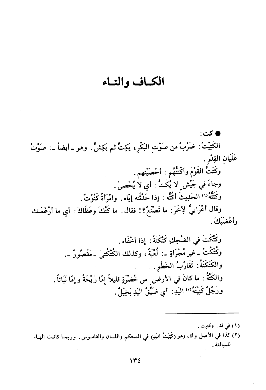 كت الكَتِيْتُ : ضَرْبٌ من صَوْتِ البَكْرِ ، يَكِتُ ثم يَكِشُّ . وهو - أيضاً - : صَوْتُ غلَيَانِ القِدْرِ . وكَتَتُّ القَوْمَ وأكْتَتُهُم : أحْصَيْتهم . وجاءَ في جَيْشٍ لا يُكَتُّ : أي لا يُحْصى . وكَتَتهُ الحَدِيث أكُتُّه : إذا حَدَّثْته إيّاه . وامْرَأة كَتُوْتٌ . وقال أعْرَابيٌّ لآخَرَ : ما تَصْنَعُ ؟ فقال : ما كَتَّكَ وعَظَاكَ : أي ما أرْغَمَك أغضَبَكَ . وكَتْكَتَ في الضَّحِكِ كَتْكَتَةً : إذا أخْفَاه . وكُتْكُتُ - غير مُجْرَاةٍ - : لُعْبَةٌ ، وكذلك الكتْكُتى - مَقْصُورٌ - . والكَتْكَتَةُ : تَقَاربُ الخَطْوِ . والكَتَةُ : ما كانَ في الأرض من خُضْرَةٍ قليلاً إِمّا رَيِّحَةً وإمّا نَبَاتاً . ورَجُلٌ كَتِيْتَهُ اليَدِ : أي ضَيِّقُ اليَدِ بَخِيْلٌ .