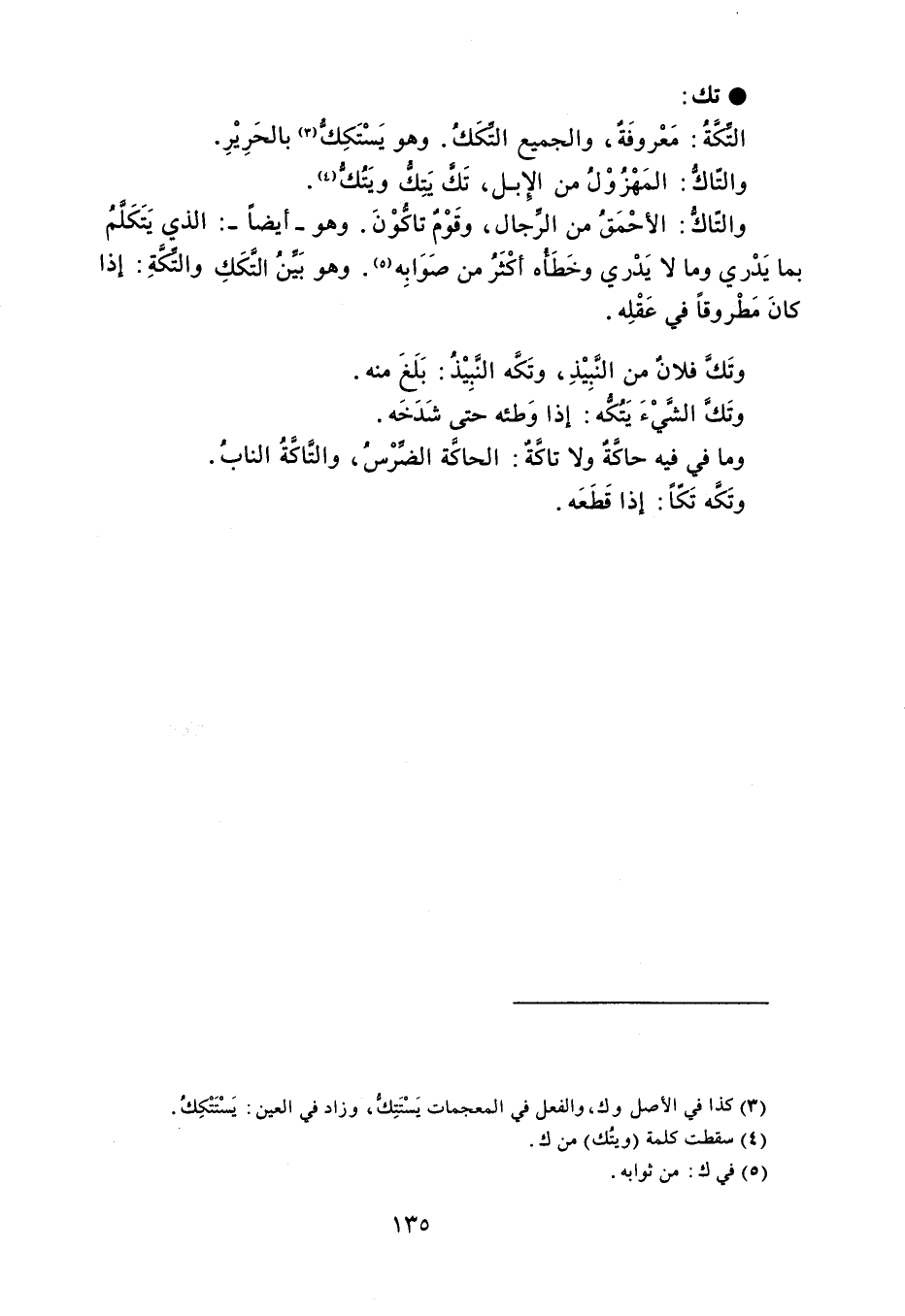 تك التكَةُ : مَعْروفَةٌ ، والجميع التكَكُ . وهو يَسْتَكِكُّ بالحَرِيْرِ . والتّاكُّ : المَهْزُوْلُ من الإبل ، تَك يَتِكَ ويَتُكُّ . والتّاكُّ : الأحْمَقُ من الرجال ، وقَوْمٌ تاكُوْنَ . وهو - أيضاً - : الذي يَتَكَلُّمُ بما يَدْري وما لا يَدْري وخَطَأًه أكْثَرُ من صَوَابِه . وهو بَين التَكَكِ والتكَّةِ : إذا كانَ مَطْروقاً في عَقْلِه . وتَكَّ فلان من النَّبِيْذِ ، وتكَّه النَّبِيْذُ : بَلَغَ منه . وتكَّ الشَّيْءَ يَتُكُّه : إذا وَطئه حتى شَدَخَه . وما في فيه حاكَّة ولا تاكَّةٌ : الحاكَّة الضِّرْسُ ، والتَّاكَةُ النابُ . وتَكَّه تَكّاً : إذا قَطَعَه .