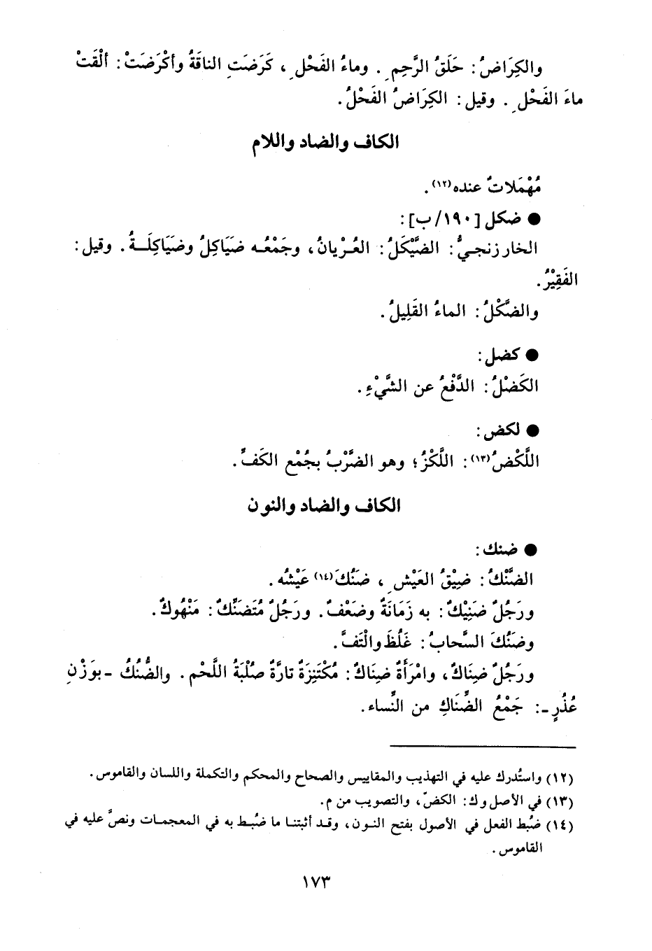 مُهْمَلاتُ عنده . ضكل الخارزنجيُّ : الضَّيْكَل : العُرْيانُ ، وجَمْعُه ضَيَاكِلُ وضَيَاكِلَةُ . وقيل : الفَقِيْرُ . والضَكْل : الماءُ القَلِيلُ . كضل الكَضْلُ : الدَّفْعُ عن الشَّيْءِ . لكض اللَّكْضُ : اللَّكْزُ وهو الضَّرْبُ بجُمْع الكَفِّ .