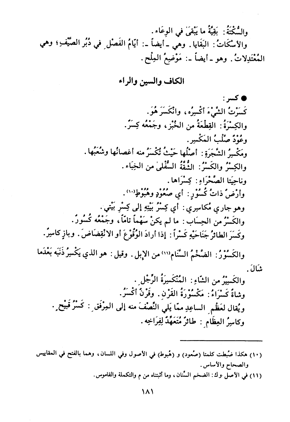 كسر كَسَرْتُ الشَّيْءَ أكْسِرُه ، وانْكَسَرَ هُوَ . والكِسْرَةُ : القِطْعَةُ من الخُبْز ، وجَمْعُه كِسَرٌ . وعُوْدٌ صُلْبُ المَكْسِر . ومَكْسِرُ الشَّجَرَةِ : أصْلُها حَيْثُ تُكْسَرُ منه أغصانُها وشُعَبُها . والكِسْرُ والكَسْرُ : الشُّقةُ السُّفْلى من الخِبَاء . وناحِيَتا الصَّحْرَاءِ : كِسْرَاها . وأرْضٌ ذاتُ كُسُوْرٍ : أي صُعُوْدٍ وهُبُوْطٍ . وهو جاري مُكاسِري : أي كِسْرُ بيتهِ إلى كِسْرِ بَيْتي . والكَسْرُ من الحِسَاب : ما لم يكنْ سَهْماً تامّاً ، وجَمْعُه كُسُورٌ . وكَسَرَ الطائرُ جَنَاحَيْهِ كَسْراً : إذا أرادَ الوُقُوْعَ أو الانْقِضَاضَ . وبازٍ كاسِرٌ . والكَسُوْرُ : الضخْمُ السَّنَام من الإِبل . وقيل : هو الذي يَكْسِرُ ذَنَبَه بَعْدَما شَالَ . والكَسِيْرُ من الشّاءِ : المُنْكَسِرَةُ الرِّجْلِ . وشاةٌ كَسْرَاءُ : مَكْسُوْرَةُ القَرْنِ . وقَرْنٌ أكْسَرُ . ويُقال لعَظْم الساعِدِ ممّا يَلي النصْفَ منه إلى المِرْفَق : كَسْرُ قَبيْح . وكاسِرُ العِظَام : طائر مُتَعَهِّدٌ لِفِرَاخِه .