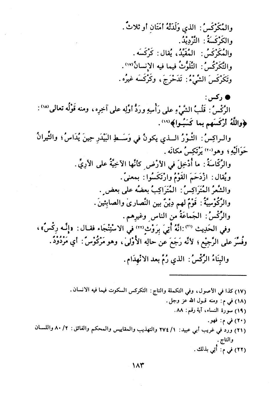 والمُكَركسُ : الذي وَلدتْهُ أمَتَانِ أو ثلاثَ . والكَرْكَسَةُ : التَّرْدِيْدُ . والمُكَرْكَسُ : المُقَيَّدُ ، يُقال : كَرْكَسَه . والتَكَرْكُسُ : التَّلَوُّثُ فيما فيه الإِنسانُ . وتَكَرْكَسَ الشَّيْءُ : تَدَحْرَجَ ، وكَرْكَسَه غيرُه . ركس الرَّكْسُ : قَلْبُ الشَّيْءِ على رَأسِهِ ورَدُّ أوََّله على آخِرِه ، ومنه قَوْلُه تعالى : ' واللهُ أرْكَسَهم بما كَسَبُوا ' . والراكِسُ : الثوْرُ الذي يكونُ في وَسَطِ البَيْدَرِ حِينَ يُدَاسُ والثيرانُ حَوَالَيْهِ وهو يَرْتَكِسُ مكانَه . والركّاسَةُ : ما أُدْخِلَ في الأرْض كأنَّها الآخِيَّةُ على الأرِيِّ . ويُقال : ازْدَحَمَ القَوْمُ وارْتَكَسُوا : بمعنىً . والشَّعرُ المُتَرَاكِسُ : المُتَرَاكِبُ بعضُه على بعض . والرَّكُوْسِيَّةُ : قَوْمٌ لهم دِيْنٌ بين النَّصارى والصابِئينَ . والرِّكْسُ : الجَماعَةُ من الناس وغيرِهم . وفي الحَدِيث : انهُ أُتيَ بِرَوْثٍ في الاسْتِنْجَاء فقال : ' إنَه رِكْسٌ ' ، وفُسِّرَ على الرَّجِيْع لأنَّه رَجَعَ عن حالِه الأُوْلى ، وهو مَرْكوسُ : أي مَرْدُوْدٌ . والبِنَاءُ الرِّكْسُ : الذي رُمَّ بعد الانْهِدَام .