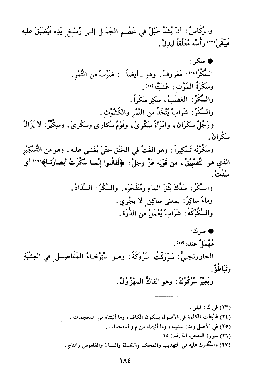 والركَاسُ : أنْ يُشَدَّ حَبْلٌ في خَطْم الجَمَل إلى رُسْغ يَدِه فَيُضَيّقَ عليه فَيَبْقَى رأسُه مُعَلَقاً لِيَذِلَّ . سكر السُّكَرُ : مَعْروفٌ . وهو - أيضاً - : ضَرْبُ من التَّمْرِ . وسَكْرَةُ المَوْتِ : غَشْيَتُه . والسَّكَرُ : الغَضَبُ ، سَكِرَ سَكَراً . والسَكَرُ : شَرابٌ يُتَخَذُ من التَّمْرِ والكُشُوْثِ . ورَجُلٌ سَكْرَان ، وامْرَأة سَكْرى ، وقَوْمٌ سُكارى وسَكْرى . وسِكيْرٌ : لا يَزَالُ سكْرانَ . وسَكَرْتُه تَسْكِيراً : وهو الغَتُّ في الخَنْق حتّى يُغْشى عليه . وهو من التًّسْكِيْرِ الذي هو التَضيِيْقُ ، من قَوْله عَزَّ وجلَّ : ' لَقالُوا إنَّما سُكرَتْ أبصارُنا ' أي سُدَّتْ . والسَكْرُ : سَدُّكَ بَثْقَ الماء ومُنْفَجَرَه . والسكْرُ : السَّدَادُ . وماءٌ ساكِر : بمعنى ساكِن لا يَجْري . والسكُرْكَةُ : شَرَابٌ يُعْمَلُ من الذُّرَةِ . سرك مُهْمَلٌ عنده . الخارزنجيُّ : سَرْوَكت سَرْوَكَةً : وهو اسْتِرْخاءُ المَفَاصِل في المِشْيَةِ وتَبَاطُؤٌ . وبَعِيْر سُرْكُوْكٌ : وهو الفاكُّ المَهْزُوْلُ .