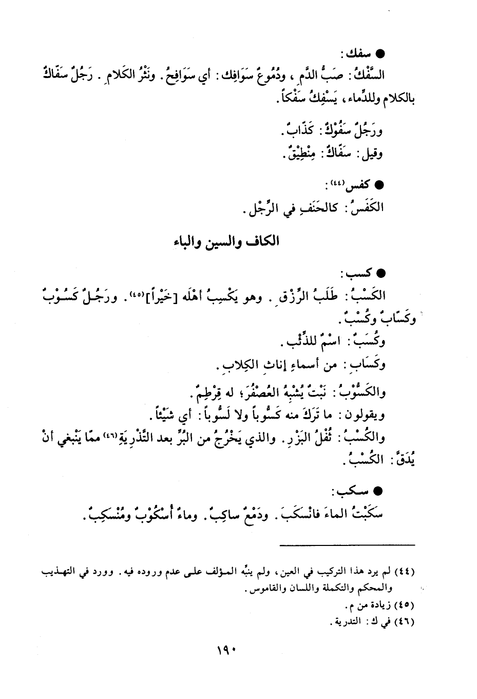سفك السَّفْكُ : صَبُّ الدَّم ، ودُمُوع سَوَافِك : أي سَوَافِحُ . ونَثْرُ الكَلام . رَجُلٌ سَفّاكٌ بالكلام وللدَماء ، يَسْفِكُ سَفْكاً . ورَجُل سَفُوْكٌ : كَذّابٌ . وقيل : سَفّاكٌ : مِنْطِيْقٌ . كفس الكَفَسُ : كالحَنَفِ في الرِّجْل .