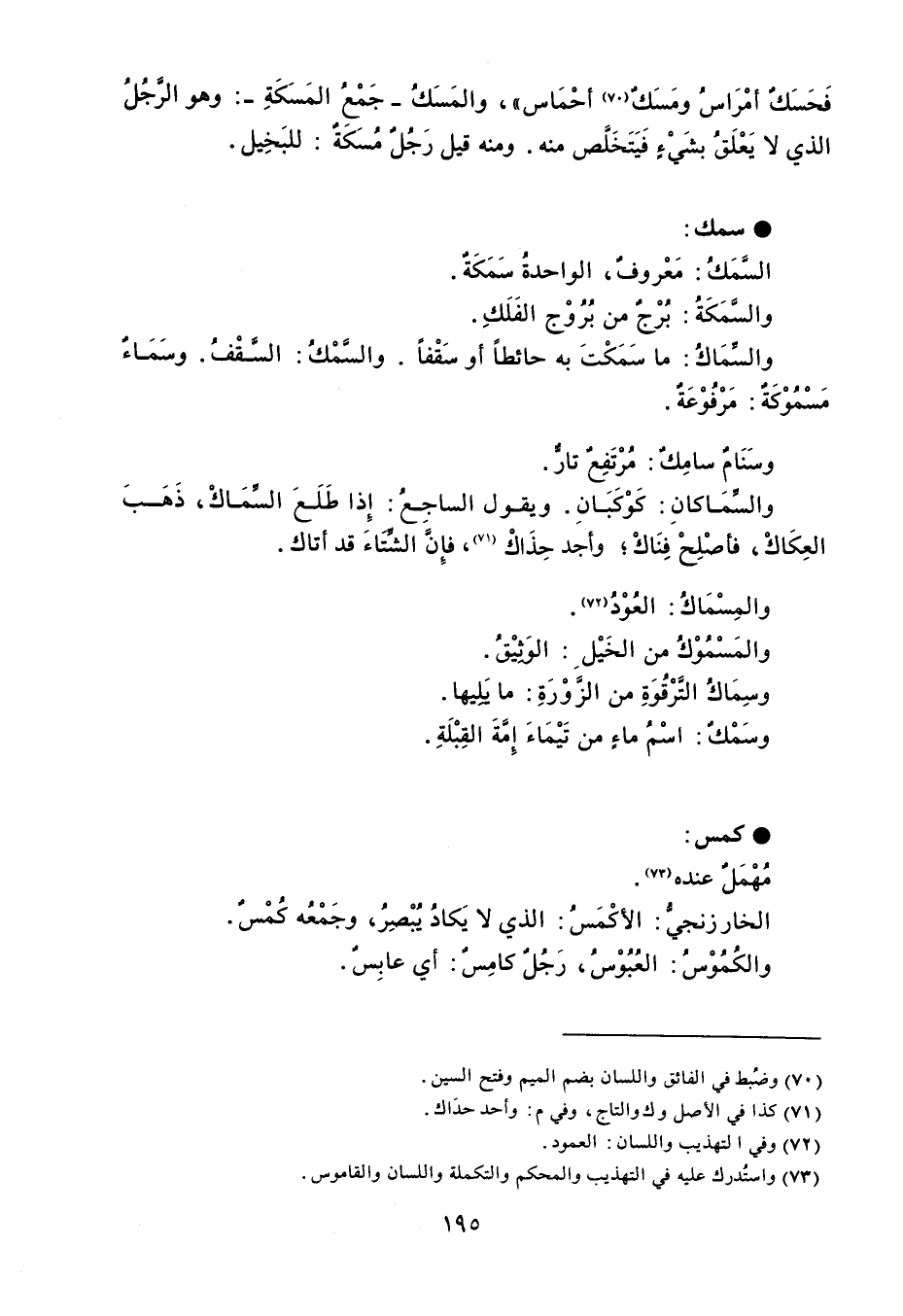 فَحَسَكٌ أمْرَاسُ ومَسَكٌ أحْمَاس ' ، والمَسَكُ - جَمْعُ المَسَكَةِ - : وهو الرَّجُلُ الذي لا يَعْلَق بشَيْءٍ فَيَتَخلَّص منه . ومنه قيل رَجُلٌ مُسَكَة : للبَخِيل . سمك السَّمَكُ : مَعْروفٌ ، الواحدةُ سَمَكَةٌ . والسَّمَكَةُ : بُرْجٌ من بُرُوْج الفَلَكِ . والسِّمَاكُ : ما سَمَكْتَ به حائطاً أو سَقْفاً . والسَّمْكُ : السَّقْفُ . وسَمَاءٌ مَسْمُوْكَةٌ : مَرْفُوْعَةٌ . وسَنَامٌ سامِكٌ : مُرْتَفِعٌ تارٌّ . والسِّمَاكانِ : كَوْكَبَانِ . ويقول الساجِعُ : إِذا طَلَعَ السِّمَاكْ ، ذَهَبَ العِكَاكْ ، فأصْلِحْ فِنَاكْ وأجد حِذَاكْ ، فإِن الشِّتَاءَ قد أتاك . والمِسْمَاكُ : العُوْدُ . والمَسْمُوْكُ من الخَيْل : الوَثيْقُ . وسِمَاكُ التَّرْقُوَةِ من الزَّوْرَةِ : ما يَليها . وسَمْكٌ : اسْمُ ماءٍ من تَيْمَاء إِمَّةَ القِبْلَةِ . كمس مُهْمَلٌ عنده . الخارزنجيُ : الأكْمَسُ : الذي لا يَكادُ يُبْصِرُ ، وجَمْعُه كُمْسٌ . والكُمُوْسُ : العُبُوْسُ ، رَجُلٌ كامِسٌ : أي عابِسٌ .