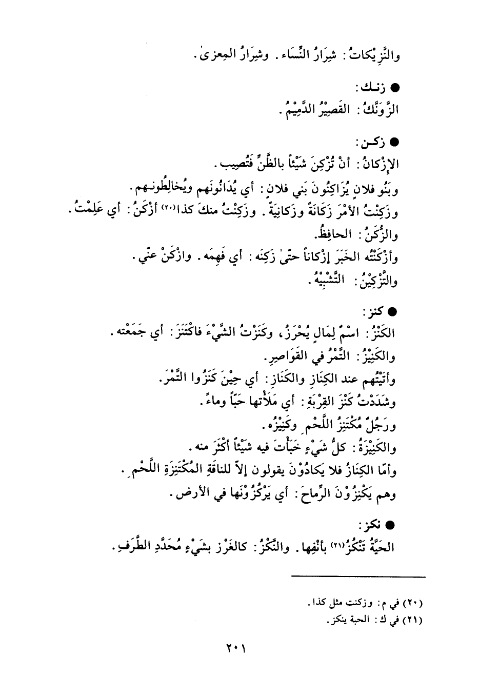 والنَّزِيْكاتُ : شِرَارُ النَسَاء . وشِرَارُ المِعزى . زنك الزِّوَنَّكُ : القَصِيْرُ الدَّمِيْمُ . زكن الإِزْكانُ : أنْ تُزْكِنَ شَيْئاً بالظَّن فَتُصِيب . وبَنُو فلانٍ يُزَاكِنُونَ بَني فلانٍ : أي يُدَانُونَهم ويُخالِطُونهم . وزَكِنْتُ الأمْرَ زَكَانَةً وزَكانِيَةً . وزَكِنْتُ منكَ كذا أزْكَنُ : أي عَلِمْتُ . والزُّكَنُ : الحافِظُ . وأزْكَنْته الخَبَرَ إزْكاناً حتّى زَكِنَه : أي فَهِمَه . وازْكَنْ عنّي . والتَزْكِيْن : التَّشْبِيْهُ . كنز الكَنْزُ : اسْمٌ لِمَالٍ يُحْرَزُ ، وكَنَزْتُ الشَّيْءَ فاكْتَنَزَ : أي جَمَعْته . والكَنِيْزُ : التَّمْرُ في القَوَاصِرِ . وأتَيْتُهم عند الكِنَازِ والكَنَازِ : أي حِيْنَ كَنَزُوا التَمْرَ . وشَدَدْتُ كَنْزَ القِرْبَةِ : أي مَلأتها حَبّاً وماءً . ورَجُلٌ مُكْتَنِزُ اللَّحْم وكَنِيْزُه . والكَنِيْزَةُ : كلُّ شَيْءٍ خَبَأتَ فيه شَيْئاً أكْثَرَ منه . وأمّا الكِنَازُ فلا يَكادُوْنَ يقولون إلاّ للناقَةِ المُكْتَنِزَةِ الفَحْم . وهم يَكْنِزُوْنَ الرِّماحَ : أي يَرْكُزُوْنَها في الأرض . نكز الحَيَّةُ تَنْكُزُ بأنْفِها . والنَكْزُ : كالغَرْز بشَيْءٍ مُحَدَّدِ الطَّرَفِ .
