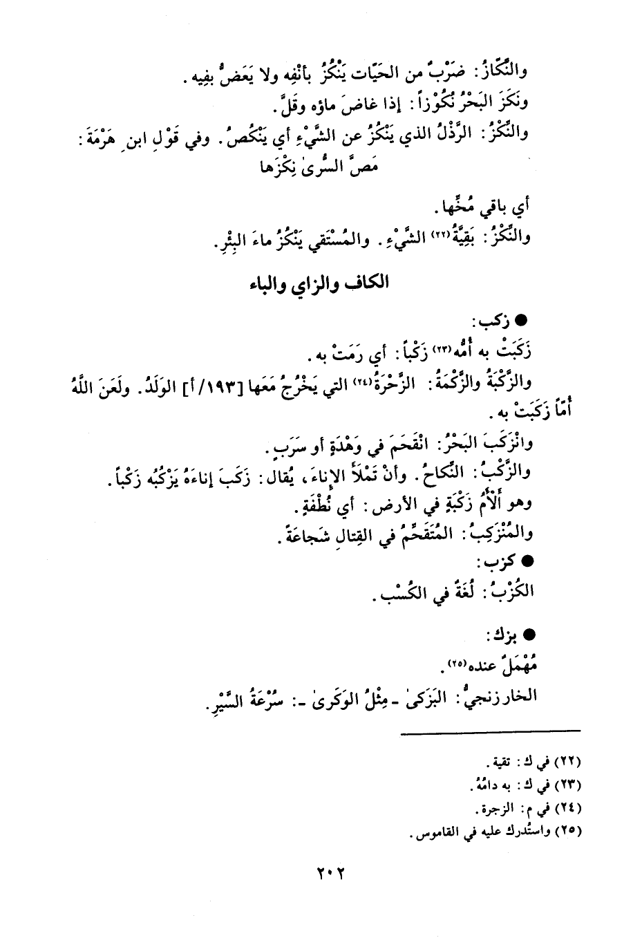 زكب زَكَبَتْ به أُمُّه زَكْباً : أي رَمَتْ به . والزَّكْبَةُ والزَّكْمَة : الزَّحْرَةُ التي يَخْرُجُ مَعَها الوَلَدُ . ولَعَنَ اللَهُ أُمّاً زَكَبَتْ به . وانْزَكَبَ البَحْرُ : انْقَحَمَ في وَهْدَةٍ أو سَرَبٍ . والزَّكْبُ : النِّكاحُ . وأنْ تَمْلأ الإناءَ ، يُقال : زَكَبَ إناءَهُ يَزْكُبُه زَكْباً . وهو ألأمُ زَكْبَةٍ في الأرض : أي نُطْفَةٍ . والَمُنْزَكِبُ : المُتَقَحِّمُ في القِتالِ شَجاعَةً . كزب الكُزْبُ : لُغَة في الكُسْب . بزك مُهْمَلٌ عنده . الخارزنجيُّ : البَزَكى - مِثْلُ الوَكَرى - : سُرْعَةُ السَّيْرِ .