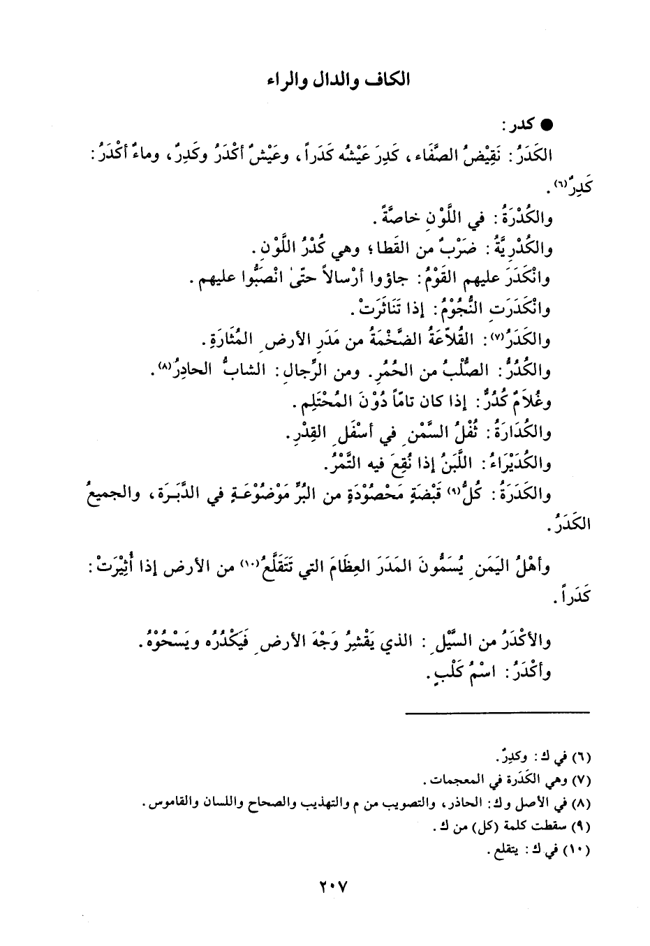 كدر الكَدَرُ : نَقِيْضُ الصَّفَاء ، كَدِرَ عَيْشُه كَدَراً ، وعَيْشٌ أكْدَرُ وكَدِرٌ ، وماءٌ أكْدَرُ : كَدِرٌ . والكُدْرَة : في اللَّوْنِ خاصَّةً . والكُدْرِيَّةُ : ضَرْبٌ من القَطا وهي كُدْرُ اللَّوْنِ . وانْكَدَرَ عليهم القَوْمُ : جاؤوا أرْسالاً حتّى انْصَبُّوا عليهم . وانْكَدَرَتِ النُّجُوْمُ : إذا تَنَاثَرَتْ . والكَدَرُ : القُلاّعَةُ الضَّخْمَةُ من مَدَرِ الأرض المُثَارَةِ . والكُدُرُّ : الصُّلْبُ من الحُمُرِ . ومن الرجالِ : الشابُّ الحادِرُ . وغُلاَمٌ كُدُرٌ : إذا كان تامّاً دُوْنَ المُحْتَلِم . والكُدَارَةُ : ثفْلُ السَّمْن في أسْفَل القِدْرِ . والكدَيْرَاءُ : اللَّبَنُ إذا نُقِعَ فيه التَّمْرُ . والكَدَرَةُ : كُل قَبْضَةٍ محْصُوْدَةٍ من البُرِّ مَوْضُوْعَةٍ في الدَّبَرَة ، والجميعُ الكَدَرُ . وأهْل اليَمَن يُسَمُّونَ المَدَرَ العِظَامَ التي تَتَقَلَعُ من الأرض إذا أُثِيْرَتْ : كَدَراً . والأكْدَرُ من السَّيْل : الذي يَقْشِرُ وَجْهَ الأرضِ فَيَكْدُرُه ويَسْحُوْهُ . وأكْدَرُ : اسْمُ كَلْبٍ .