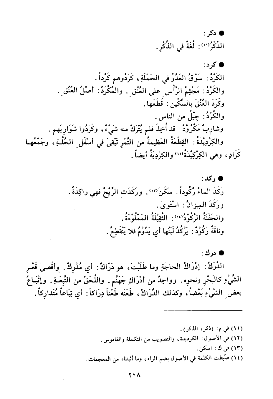دكر الدِّكْرُ : لُغَةٌ في الذِّكْرِ . كرد الكَرْدُ : سَوْقُ العَدُوِّ في الحَمْلَةِ ، كَرَدُوهم كَرْداً . والكَرْدُ : مَجْثِمُ الرَّأْس على العُنُق . والمُكْرَدُ : أصْل العُنُق . وكَرَدَ العُنُقَ بالسِّكِّين : قَطَعَها . والكُرْدُ : جِيْلٌ من الناس . وشارِبٌ مَكْرُوْدٌ : قد أُخِذَ فلم يُتْرَكْ منه شَيْءٌ ، وكَرَدُوا شَوَارِبَهم . والكِرْدِيْدَةُ : القِطْعَةُ العَظيمة من التَّمْرِ تَبْقى في أسْفَل الجُلَّةِ ، وجَمْعُها كَرَادٍ ، وهي الكِرْكِيْدَةُ والكِرْدِيَةُ أيضاً . ركد رَكَدَ الماءُ رُكُوداً : سَكَنَ . ورَكَدَتِ الرِّيْحُ فهي راكِدَةٌ . ورَكَدَ المِيزانُ : اَسْتَوى . والجَفْنَةُ الرَّكُوْدُ : الثَّقِيْلَةُ المَمْلُوْءَةُ . وناقَةٌ رَكُوْدٌ : يَرْكُدُ لَبَنُها أي يَدُوْمُ فلا يَنْقَطِعُ . درك الدَّرَكُ : إدْرَاكُ الحاجَةِ وما طَلَبْتَ ، هو دَرّاك : أي مُدْرِكٌ . وأقْصى قَعْرِ الشَّيْءِ كالبَحْرِ ونحوِه . وواحِدٌ من أدْرَاكِ جَهَنَم . واللَّحَقُ من التَّبِعَةِ . وإتْبَاعُ بعض الشَّيْءِ بَعْضاً ، وكذلك الدِّرَاكُ ، طَعَنَه طَعْناً دِرَاكاً : أي تِبَاعاً مُتَدارِكاً .