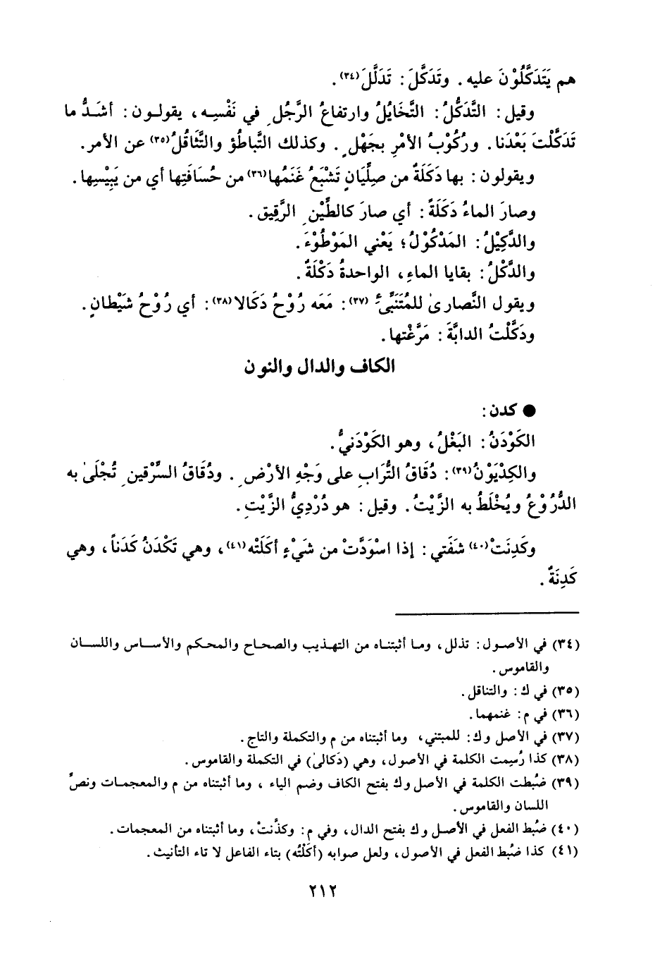 كدن الكَوْدَن : البَغْلُ ، وهو الكَوْدَني . والكِدْيَوْنُ : دُقَاقُ التُرَابِ على وَجْهِ الأرْض . ودُقَاقُ السِّرْقين تجْلَى به الدُّرُوْعُ ويُخْلَطُ به الزَّيْتُ . وقيل : هو دُرْدِي الزَّيْتِ . وكَدِنَتْ شَفَتي : إذا اسْوَدَّتْ من شَيْءٍ أكَلَتْه ، وهي تَكْدَنُ كَدَناً ، وهي كَدِنَةٌ .