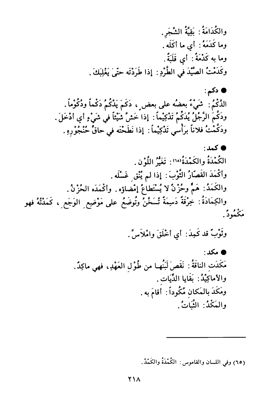 والكُدَامَةُ : بَقِيَّةُ الشَّجَرِ . وما كَدَمَهُ : أي ما أكَلَه . وما به كَدْمَةٌ : أي قَلَبَةٌ . وكَدَمْتُ الصَّيْدَ في الطَّرْدِ : إذا طَرَدْتَه حتّى يَغْلِبَكَ . دكم الدََكْمُ : شَيْءٌ بعضُه على بعض ، دَكَمَ يَدْكُمُ دَكْماً ودُكُوْماً . ودَكَمَ الرجُلُ يُدَكِّمُ تَدْكِيْماً : إذا خَشَّ شَيْئاً في شَيْءٍ أي أدْخَلَ . ودَكَّمْتُ فلاناً برأسي تَدْكِيْماً : إذا نَطَحْتَه في حاقِّ حُنْجُوْرِهِ . كمد الكُمْدَة والكَمْدَةُ : تَغَيُّرُ اللَّوْن . وأكْمَدَ القَصّارُ الثَّوْبَ : إذا لم يُنْقِ غَسْلَه . والكَمَدُ : هَم وحُزْنٌ لا يُسْتَطاعُ إمْضاؤه . وأكْمَدَه الحُزْنُ . والكِمَادَةُ : َخِرْقَةٌ دَسِمَة تُسَخَّنُ وتُوضَعُ على مَوْضِع الوَجَع ، كَمَدْتُهُ فهو مَكْمُودٌ . وثَوْبٌ قد كَمِدَ : أي أخْلَقَ وامْلاسَّ . مكد مَكَدَتِ الناقَةُ : نَقَصَ لَبَنُها من طُوْلِ العَهْدِ ، فهي ماكِدٌ . والأماكِيْدُ : بَقَايا الدِّيَاتِ . ومَكَدَ بالمَكانِ مُكُوداً : أقامَ به . والمَكْدُ : الثَّبَاتُ .