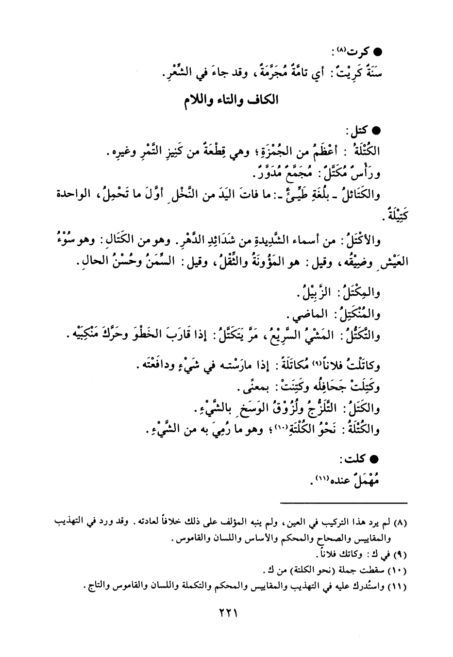 كتل الكُتْلَة : أعْظَمُ من الجُمْزِةِ وهي قِطْعَةٌ من كَنِيزِ التَّمْرِ وغيرِه . ورَأسٌ مُكَتَّلٌ : مُجَمَّعٌ مُدَوَّرٌ . والكَتَائلُ - بلُغَةِ طَيىءٍ - : ما فاتَ اليَدَ من النَّخْل أوَّلَ ما تَحْمِلُ ، الواحدة كَتيْلَةٌ . والأكْتَلُ : من أسماء الشَّدِيدةِ من شَدَائِدِ الدَّهْرِ . وهو من الكَتَالِ : وهو سُوْءُ العَيْش وضِيْقُه ، وقيل : هو المَؤُونَةُ والثقْلُ ، وقيل : السِّمَنُ وحُسْنُ الحالِ . والمِكْتَلُ : الزَّبِيْلُ . والمُنْكَتِلُ : الماضي . والتَّكَتُلُ : المَشْيُ السَّرِيْعُ ، مَرَّ يَتَكَتَّلُ : إذا قَارَبَ الخَطْوَ وحَرَّكَ مَنْكِبَيْه . وكاتَلْتُ فلاناً مُكاتَلَةً : إذا مارَسْته في شَيْءٍ ودافَعْتَه . وكَتِلَتْ جَحَافِلُه وكَتِنَتْ : بمعنًى . والكَتَلُ : التَّلَزجُ ولُزُوْقُ الوَسَخ بالشَّيْءِ . والكُتْلَةُ : نَحْوُ الكُلْتَةِ وهو ما رُمِيَ به من الشَّيْءِ . كلت مُهْمَل عنده .