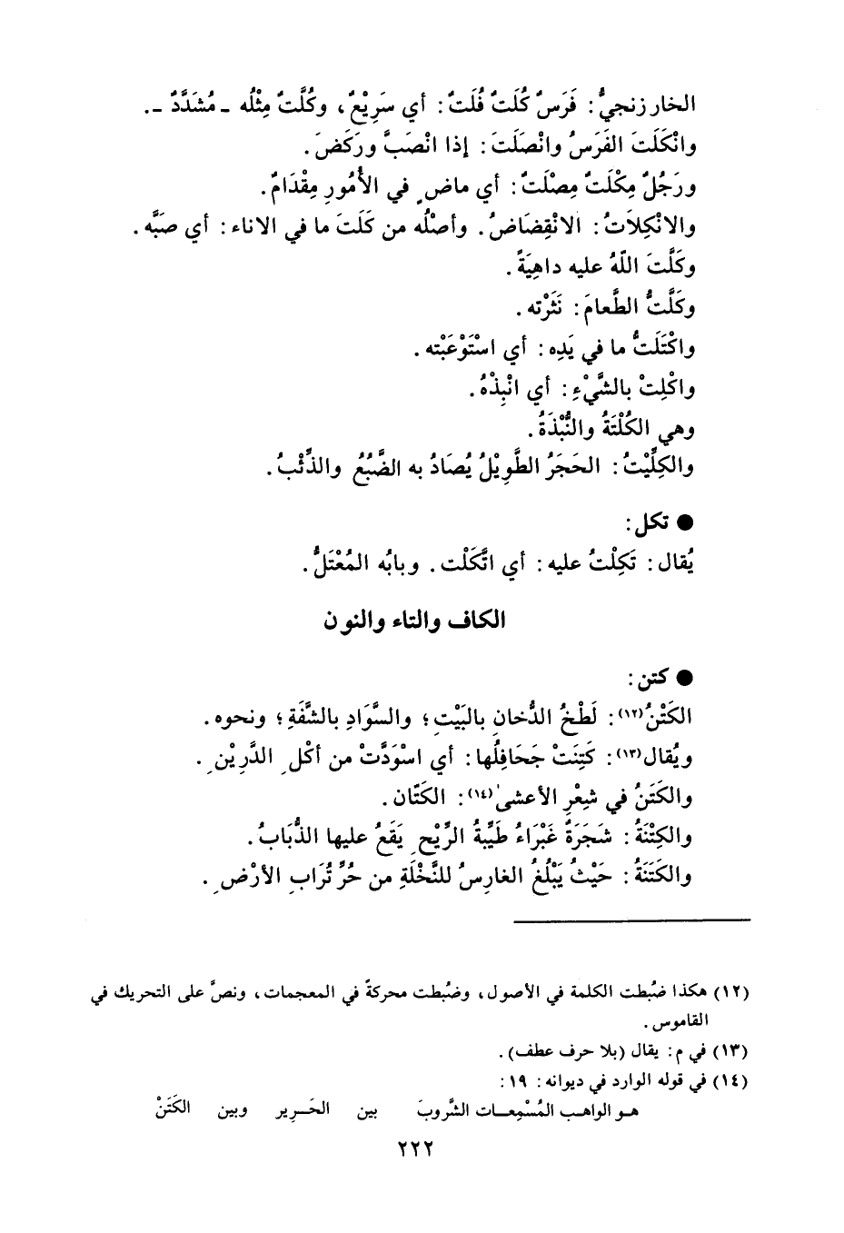 الخارزنجي : فَرَسٌ كُلَتٌ فُلَتٌ : أي سَرِيْعٌ ، وكُلَّتٌ مِثْلُه - مُشَدَدٌ . وانْكَلَتَ الفَرَسُ وانْصَلَتَ : إذا انْصَبَّ وركَضَ . ورَجُلٌ مِكْلَتٌ مِصْلَتٌ : أي ماضٍ في الأُمُورِ مِقْدَامٌ . والانْكِلاَتُ : الانْقِضَاضُ . وأصْلُه من كَلَتَ ما في الاناء : أي صَبَّه . وكَلَّتَ اللّهُ عليه داهِيَةً . وكَلَّت الطعامَ : نَثَرْته . واكْتَلَتُ ما في يَدِه : أي اسْتَوْعَبْته . واكْلِتْ بالشَيْءِ : أي انْبِذْهُ . وهي الكُلْتَةُ والنبْذَةُ . والكلِّيْتُ : الحَجَرُ الطَّوِيْلُ يُصَادُ به الضبُعُ والذئْبُ . تكل يُقال : تَكِلْتُ عليه : أي اتَّكَلْت . وبابُه المُعْتَلُّ .