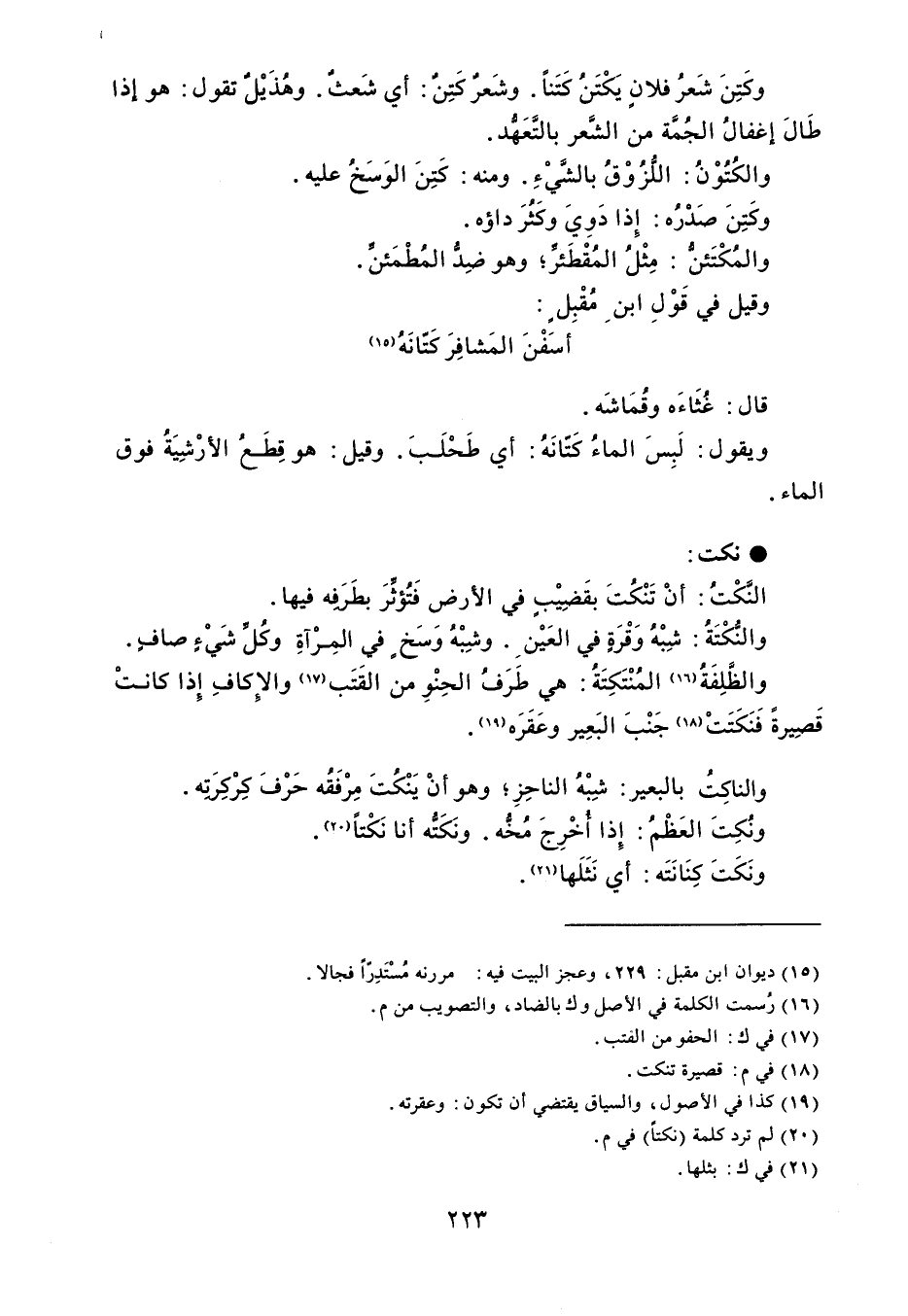 وكَتِنَ شَعرُ فلانٍ يَكْتَنُ كَتَناً . وشَعرٌ كَتِنٌ : أي شَعثُ . وهُذَيْلٌ تقول : هو إذا طَالَ إغفالُ الجُمَّة من الشَّعر بالتَّعَهُّد . والكُتُوْنُ : اللُّزُوْقُ بالشَّيْءِ . ومنه : كَتِنَ الوَسَخُ عليه . وكَتِنَ صَدْرُه : إِذا دَوِيَ وكَثُرَ داؤه . والمُكْتَئنُّ : مِثْلُ المُقْطَئرِّ وهو ضِدُّ المُطْمَئنِّ . وقيل في قَوْلِ ابن مُقْبِل : أسَفْنَ المَشافِرَ كَتّانَهُ قال : غُثَاءَه وقُمَاشَه . ويقول : لَبِسَ الماءُ كَتّانَهُ : أي طَحْلَبَ . وقيل : هو قِطَعُ الأرْشِيَةُ فوق الماء . نكت النَّكْتُ : أنْ تَنْكُتَ بقَضِيْبٍ في الأرض فَتُؤثرَ بطَرَفِه فيها . والنُّكْتَةُ : شِبْهُ وَقْرَةٍ في العَيْن . وشِبْهُ وَسَخ في المِرْآةِ وكُل شَيْءٍ صافٍ . والظَّلِفَةُ المُنْتَكِتَةُ : هي طَرَفُ الحِنْوِ من القَتَب والإِكافِ إِذا كانتْ قَصِيرةً فَنَكَتَتْ جَنْبَ البَعِير وعَقَرَه . والناكتُ بالبعير : شِبْهُ الناحِزِ وهو أنْ يَنْكُتَ مِرْفَقُه حَرْفَ كِرْكِريه . ونُكِتَ العَظْمُ : إِذا أخْرِجَ مُخُّه . ونَكَتُّه أنا نَكْتاً . ونَكَتَ كِنَانَتَه : أي نَثَلَها .