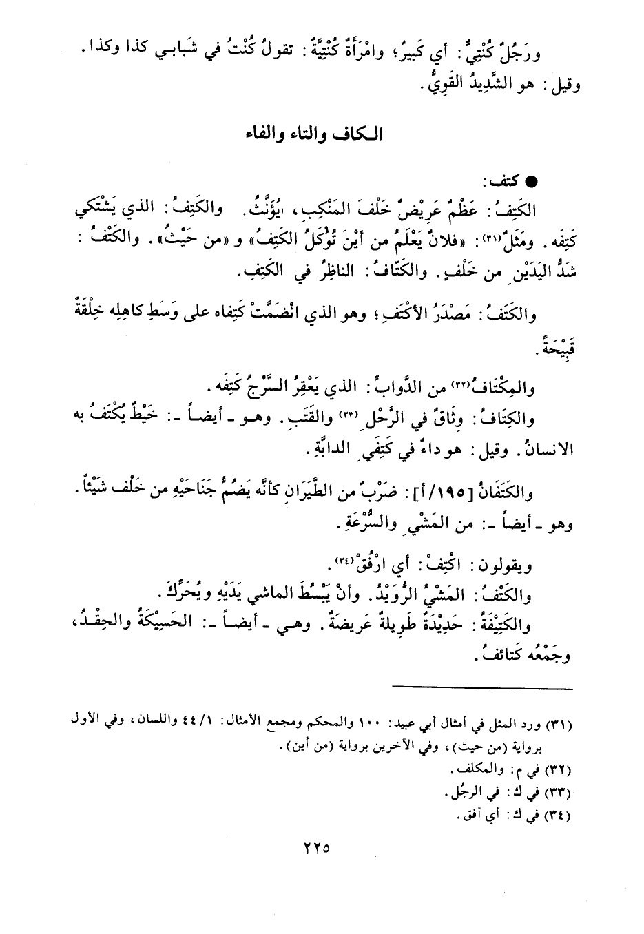 كتف الكَتِفُ : عَظْمٌ عَرِيْضٌ خَلْفَ المَنْكِبِ ، يُؤَنَّثُ . والكَتِفُ : الذي يَشْتَكي كَتِفَه . ومَثَلٌ : فلانٌ يَعْلَمُ من أيْنَ تُؤكَلُ الكَتِفُ ومن حَيْثُ . والكَتْفُ : شَدُّ اليَدَيْن من خَلْفٍ . والكَتّافُ : الناظِرُ في الكَتِفِ . ٍوالكَتَفُ : مَصْدَرُ الأكْتَفِ وهو الذي انْضَمَّتْ كَتِفاه على وَسَطِ كاهِلِه خِلْقَة قَبِيْحَة . والمِكْتَافُ من الدَّوابِّ : الذي يَعْقِرُ السَّرْجُ كَتِفَه . والكِتَافُ : وِثَاق في الرحْل والقَتَبِ . وهو - أيضاً - : خَيْطٌ يُكْتَفُ به الانسانُ . وقيل : هو داءٌ في كَتِفَي الدابَّةِ . والكَتَفَانُ : ضَرْبٌ من الطَّيَرَانِ كأنَّه يَضُم جَنَاحَيْهِ من خَلْف شَيْئاً . وهو - أيضاً - : من المَشْي والسُّرْعَةِ . ويقولون : اكْتِفْ : أي ارْفُقْ . والكَتْفُ : المَشْيُ الرُّوَيْدُ . وأنْ يَبْسُطَ الماشي يَدَيْهِ ويُحَرِّكَ . والكَتِيْفَةُ : حَدِيْدَةٌ طَوِيلةٌ عَريضَة . وهي - أيضاً - : الحَسِيْكَةُ والحِقْدُ ، وجَمْعُه كَتائفُ .