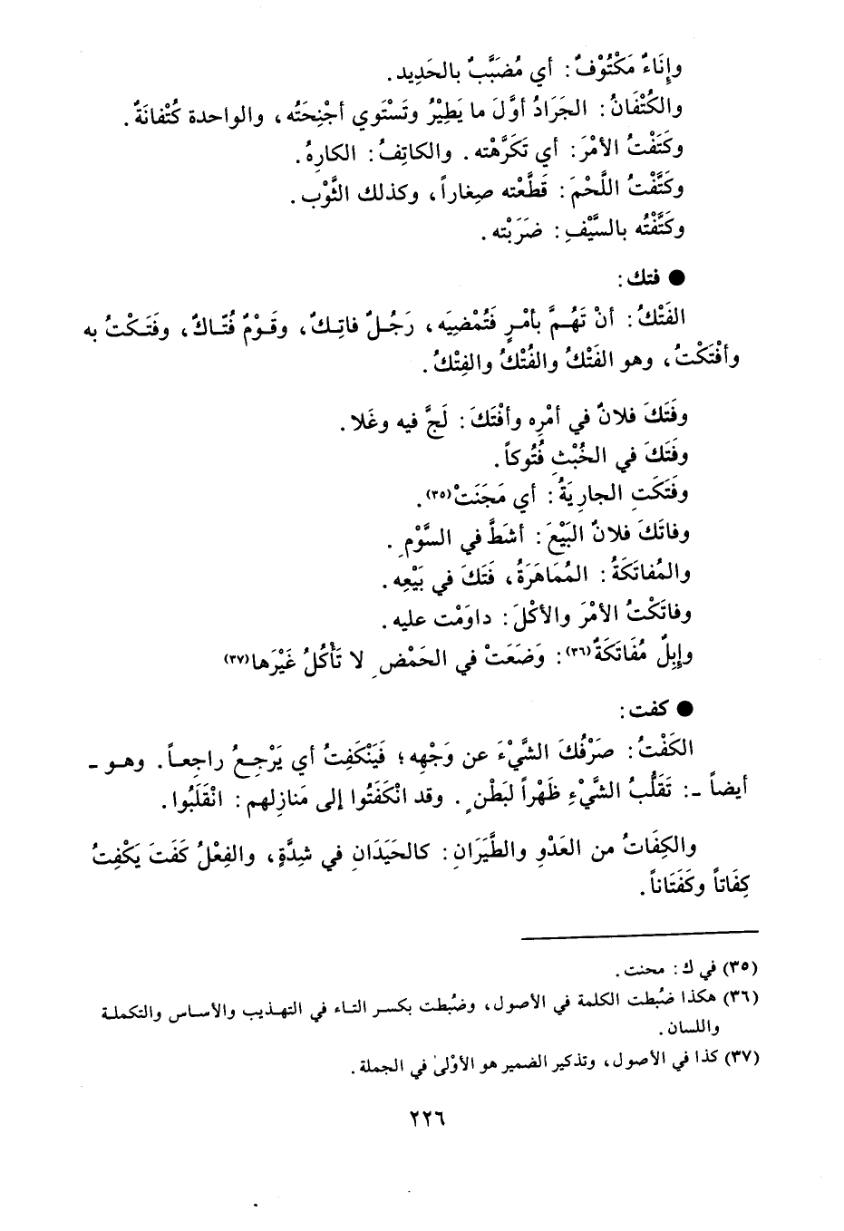 وإِنَاءُ مَكْتُوْفٌ : أي مُضَبَّبٌ بالحَديد . والكُتْفَانُ : الجَرَادُ أوَّلَ ما يَطِيْرُ وتَسْتَوي أجْنِحَتُه ، والواحدة كُتْفانَةُ . وكَتَفْتُ الأمْرَ : أي تَكَرَهْته . والكاتِفُ : الكارِهُ . وكَتَفْتُ اللَّحْمَ : قطَّعْته صِغاراً ، وكذلك الثّوْب . وكَتَّفْتُه بالسَّيْفِ : ضَرَبْته . فتك الفَتْكُ : أنْ تَهُمَّ بأمْرٍ فَتُمْضِيَه ، رَجُلٌ فاتِكٌ ، وقَوْمٌ فُتّاكٌ ، وفَتَكْتُ به وأفْتَكْتُ ، وهو الفَتكُ والفُتْكُ والفِتْكُ . وفتَكَ فلانٌ في أمْرِه وأفْتَكَ : لَجَّ فيه وغَلا . وفَتَكَ في الخُبْث فتُوكاً . وفَتَكَتِ الجارِيَةُ : أي مَجَنَتْ . وفاتَكَ فلانٌ البَيْعَ : أشَطَّ في السَّوْم . والمُفاتَكَةُ : المُمَاهَرَةُ ، فَتَكَ في بَيْعِه . وفاتَكْتُ الأمرَ والأكْلَ : داوَمْت عليه . وإبِلٌ مُفَاتَكَةٌ : وَضَعَتْ في الحَمْضِ لا تَأكُلُ غَيْرَها . كفت الكَفْتُ : صَرْفُكَ الشَّيْءَ عن وَجْهِه فَيَنْكَفِتُ أي يَرْجِعُ راجِعاً . وهو - أيضاً - : تَقَلُبُ الشَّيْءِ ظَهْراً لبَطْن . وقد انْكَفتُوا إلى مَنازِلهم : انْقَلَبُوا . والكِفَاتُ من العَدْوِ والطِّيَرَانِ : كالحَيَدانِ في شِدَّةٍ ، والفِعْل كَفَتَ يَكْفِتُ كِفاتاً وكَفَتَاناً .