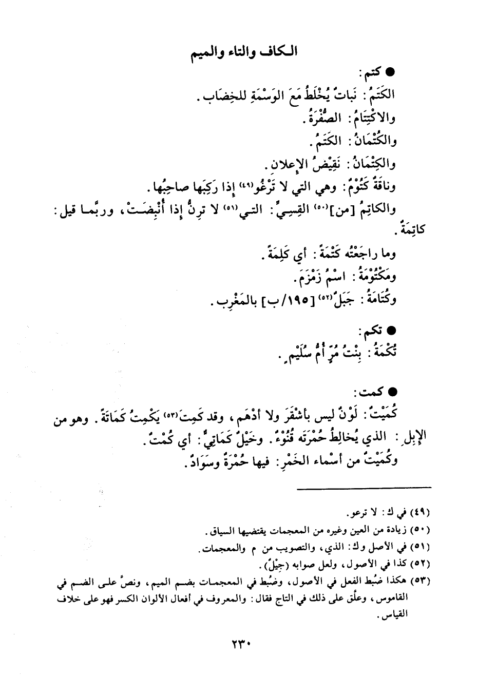 كتم الكَتَمُ : نَباتٌ يُخْلَطُ مَعَ الوَسْمَةِ للخِضَاب . والاكْتِتَامُ : الصُّفْرَةُ . والكُتْمَانُ : الكَتَمُ . والكِتْمَانُ : نَقِيْضُ الإعلانِ . وناقَةٌ كَتُوْمٌ : وهي التي لا تَرْغُو إِذا رَكِبَها صاحِبُها . والكاتِمُ من القِسِيِّ : التي لا ترِنُّ إِذا أُنْبِضَتْ ، وربَّما قيل : كاتِمَةٌ . وما راجَعْتُه كَتْمَةً : أي كَلِمَةً . ومَكْتُوْمَةُ : اسْمُ زَمْزَمَ . وكُتَامَةُ : جَبَل بالمَغْرِب . تكم تُكْمَةُ : بِنْتُ مُرٍّ أُم سُلَيْم . كمت كُمَيْتٌ : لَوْنٌ ليس بأشْقَرَ ولا أدْهَم ، وقد كَمِتَ يَكْمِتُ كَمَاتَةً . وهو من الإبِل : الذي يُخالِطُ حُمْرَتَه قُنُوْءٌ . وخَيْل كَمَاتِيٌّ : أي كُمْتٌ . وكمَيْتٌ من أسْماء الخَمْرِ : فيها حُمْرَةٌ وسَوَادٌ .