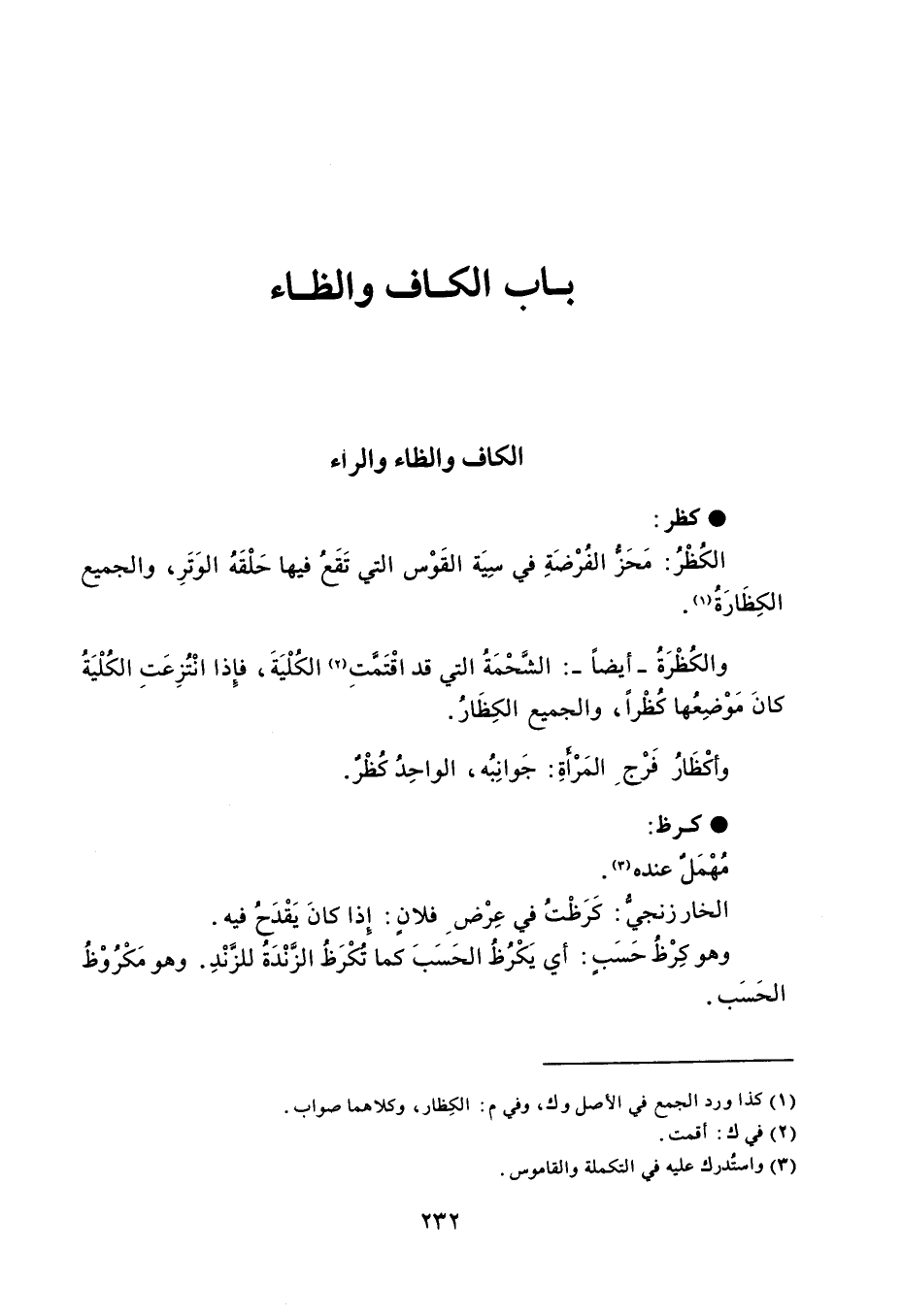 كظر الكُظْرُ : مَحَزُّ الفُرْضَةِ في سِيَة القَوْس التي تَقَعُ فيها حَلْقَهُ الوَتَرِ ، والجميع الكِظَارَةُ . والكُظْرَةُ - أيضاً - : الشَّحْمَةً التي قد اقْتمَّتِ الكُلْيَةَ ، فإِذا انْتُزِعَتِ الكُلْيَةُ كانَ مَوْضِعُها كُظْراً ، والجميع الكِظَارُ . وأكْظَارُ فَرْج المَرأةِ : جَوانِبُه ، الواحِدُ كُظْرٌ . كرظ مُهْمَلٌ عنده . الخارزنجيُّ : كَرَظْتُ في عِرْض فلانٍ : إِذا كانَ يَقْدَحُ فيه . وهو كِرْظُ حَسَبٍ : أي يَكْرُظُ الحَسَبَ كما تُكْرَظُ الزَّنْدَةُ للزَّنْدِ . وهو مكْرُوْظُ الحَسَب .
