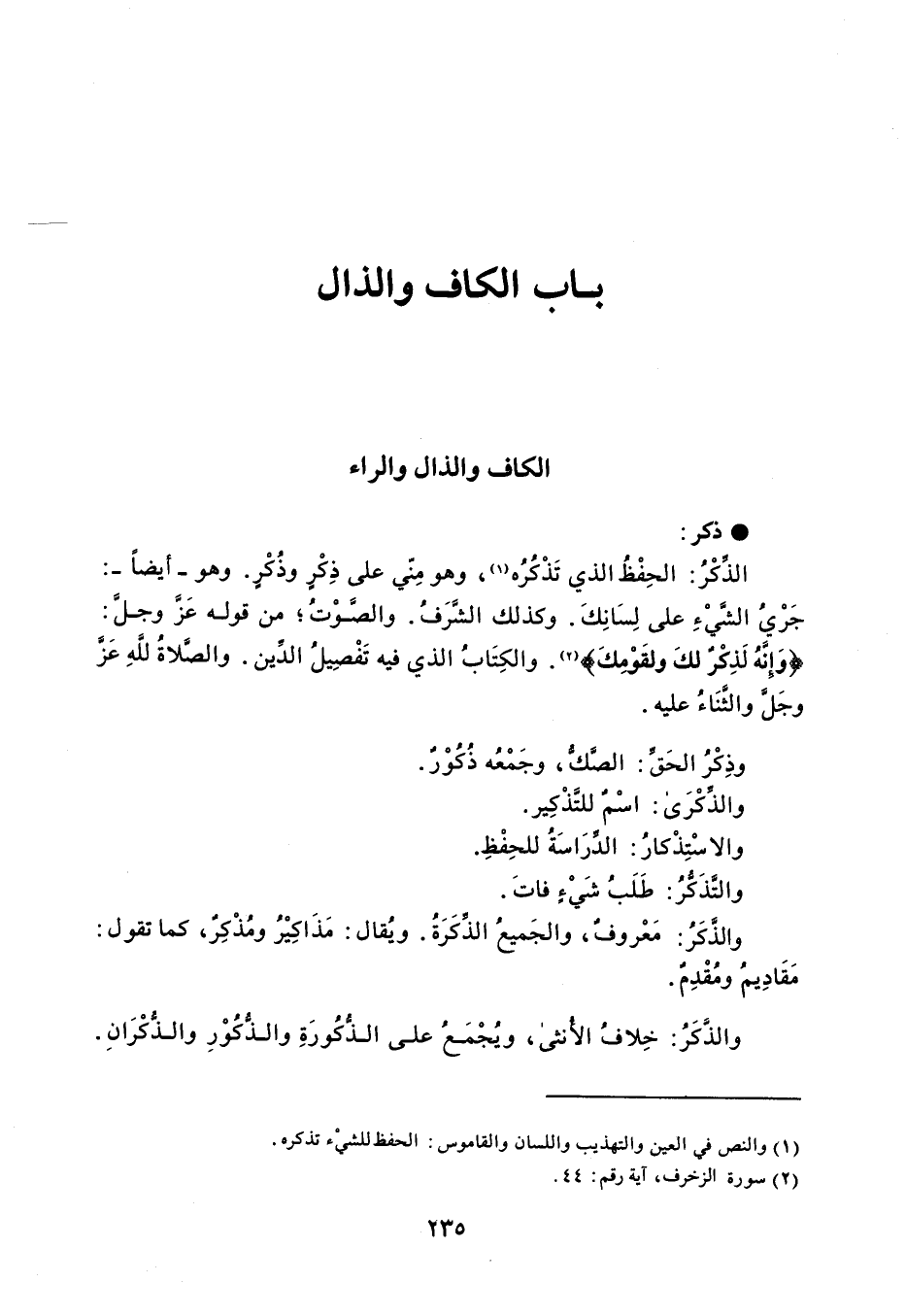 ذكر الذِّكْرُ : الحِفْظُ الذي تَذْكُرُه ، وهو مِنّي على ذِكْرٍ وذُكْرٍ . وهو - أيضاً - : جَرْيُ الشيءِ على لِسَانِكَ . وكذلك الشَّرَفُ . والصَّوْتُ من قوله عَزَّ وجل : ' وَإنهُ لَذِكْرٌ لكَ ولقَوْمِكَ ' . والكِتَابُ الذي فيه تَفْصِيلُ الذَين . والصَّلاةُ للَّهِ عَزّ وجَل والثَّنَاءُ عليه . وذِكْرُ الحَق : الصَّكُّ ، وجَمْعُه ذُكُوْرٌ . والذكْرَى : اسْمٌ للتَذْكِير . والاسْتِذْكارُ : الدِّرَاسَةُ للحِفْظ . والتَّذَكُّرُ : طَلَبُ شَيْءٍ فاتَ . والذَّكرُ : مَعْروفٌ ، والجَميعُ الذَّكَرَةُ . ويُقال : مَذَاكِيْرُ ومُذْكِر ، كما تقول : مَقَادِيمُ ومُقْدِمٌ . والذَّكرُ : خِلافُ الأُنثى ، ويُجْمَعُ على الذكُورَةِ والذُّكُوْرِ والذُّكْرَانِ .