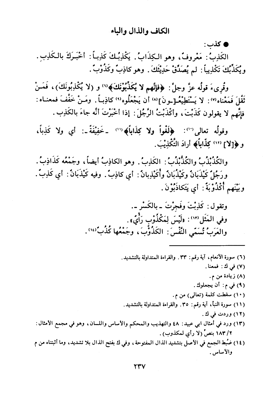 كذب الكَذِبُ : مَعْروفٌ ، وهو الكِذَابُ . يَكْذِبُكَ كَذِباً : أخْبَرَكَ بالكَذِبِ . ويُكَذبُكَ تَكْذِيباً : لم يُصَدقْ حَدِيْثَكَ . وهو كاذِبٌ وكَذُوْبٌ . وقُرِىءَ قولُه عزَّ وجل : ' فإنَّهم لا يُكَذبُوْنَكَ ' و لا يُكْذِبُوٍنَكَ ، فَمَنْ ثَقَلَ فَمَعْناه لا يَسْتَطِيْعُونَ أن يَجْعَلُوه كاذِباً . ومَنْ خَفف فمعناه : فإِنَهم لا يقولون كَذَبْتَ ، وأكْذَبْتُ الرَّجُلَ : إذا أخْبَرْتَ أنَّه جاءَ بالكَذِب . وقولُه تعالى : ' َلغْواً ولا كِذَاباً ' - خَفِيْفَةً - : أي ولا كَذِباً ، و ' لا كِذّاباً ' أرادَ التَّكْذِيْبَ . والكُذُبْذُبُ والكُذُّبْذُبُ : الكَذِبُ . وهو الكاذِبُ أيضاً ، وجَمْعُه كَذَاذِبُ . ورَجُلَ كَيْذَبَانٌ وكَيْذُبَانٌ وأُكَيْذِبانٌ : أي كاذِبٌ . وفيه كَيْذَبَانٌ : أي كَذِبٌ . وبَيْنَهم أُكْذُوْبَةٌ : أي يَتَكاذَبُوْنَ . وتقول : كَذِبْتَ وفَجِرْتَ - بالكَسْر - . وفي المَثَل : ليس لِمَكْذُوْبٍ رَأْيٌ . والعَرَبُ تُسَمّي النَّفْسَ : الكَذُوْبَ ، وجَمْعُها كُذُبٌ .
