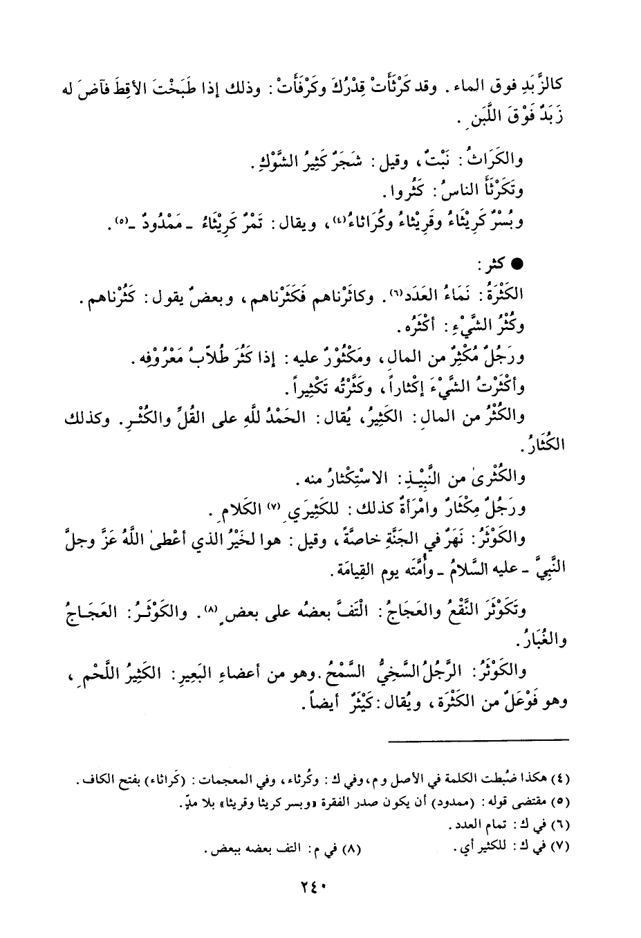 كالزَّبَدِ فوق الماء . وقد كَرْثَأَتْ قِدْرُكَ وكَرْفَأَتْ : وذلك إذا طَبَخْتَ الأقِطَ فآضَ له زَبَدٌ فَوْقَ اللَّبَنَ . والكَرَاثُ : نَبْتٌ ، وقيل : شَجَرٌ كَثِيرُ الشِّوْكِ . وتَكَرْثَأَ الناسُ : كَثُروا . وبُسْرٌ كَرِيْثَاءُ وقَرِيْثاءُ وكُرَاثاءُ ، ويقال : تَمْرٌ كَرِيْثَاءُ - مَمْدُودٌ - . كثر الكَثْرَةُ : نماَءُ العَدَد . وكاثَرْناهم فَكَثَرْناهم ، وبعضٌ يقول : كَثُرْناهم . وكُثْرُ الشَّيْءِ : أكْثَرُه . ورَجُلٌ مُكْثِرٌ من المالِ ، ومَكْثُوْرٌ عليه : إذا كَثُرَ طُلاّبُ مَعْرُوْفه . وأكْثَرْتُ الشَّيْءَ إكْثاراً ، وكَثرْتُه تَكْثِيراً . والكُثْرُ من المالِ : الكَثِيرُ ، يُقال : الحَمْدُ للَّهِ على القُل والكُثْرِ . وكذلك الكُثَارُ . والكُثْرى من النَبِيْذِ : الاسْتِكْثارُ منه . ورَجُلٌ مِكْثَارٌ وامْرَأةٌ كذلك : للكَثِيرَي الكَلام . والكَوْثَرُ : نَهَرٌ في الجَنَّةِ خاصَّةً ، وقيل : هو الخَيْرُ الذي أعْطى اللَّهُ عَز وجلَّ النَّبِيَّ - عليه السَّلامُ - وأُمَتَه يوم القِيامَة . وتَكَوْثَرَ النَّقْعُ والعَجَاجُ : الْتَفَّ بعضُه على بعض . والكَوْثَرُ : العَجَاجُ والغُبَارُ . والكَوْثَرُ : الرَّجُلُ السَّخِيُّ السَّمْحُ . وهو من أعضاءِ البَعِيرِ : الكَثِيرُ اللَّحْم ، وهو فَوْعَلٌ من الكَثْرَة ، ويُقال : كَيْثَرٌ أيضاً .