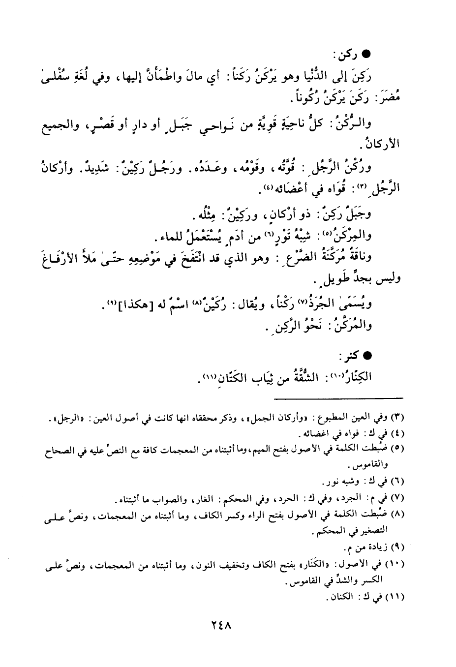 ركن رَكِنَ إلى الدُّنْيا وهو يَرْكَنُ رَكَناً : أي مالَ واطْمَأَنَّ إليها ، وفي لُغَةِ سُفْلى مُضَرَ : رَكَنَ يَرْكَنُ رُكُوناً . والرُّكْنُ : كل ناحِيَةٍ قَوِيَّةٍ من نَواحي جَبَل أو دارٍ أو قَصْرٍ ، والجميع الأركانُ . ورُكْنُ الرَّجُل : قٌوَتُه ، وقَوْمُه ، وعَدَدُه . ورَجُلٌ رَكِيْن : شَدِيدٌ . وأرْكانُ الرَّجُل : قُوَاه في أعْضَائه . وجَبَلٌ رَكِنٌ : ذو أرْكانٍ ، ورَكِيْنٌ : مِثْلُه . والمِرْكَنُ : شِبْهُ تَوْرٍ من أدَم يُسْتَعْمَلُ للماء . وناقَةٌ مُرَكَّنَةُ الضَّرْع : وهو الذي قد انْتَفَخَ في مَوْضِعِهِ حتّى مَلأ الأرْفَاغَ وليس بجدِّ طَويلٍ . ويُسَمّى الجُرَذُ رَكْنَاَ ، ويُقال : رُكَيْنٌ اسْمُ له هكذا . والمُرَكَّنُ : نَحْوُ الرَّكِن . كنر الكِنّارُ : الشُقَّةُ من ثِيَاب الكَتّانِ .