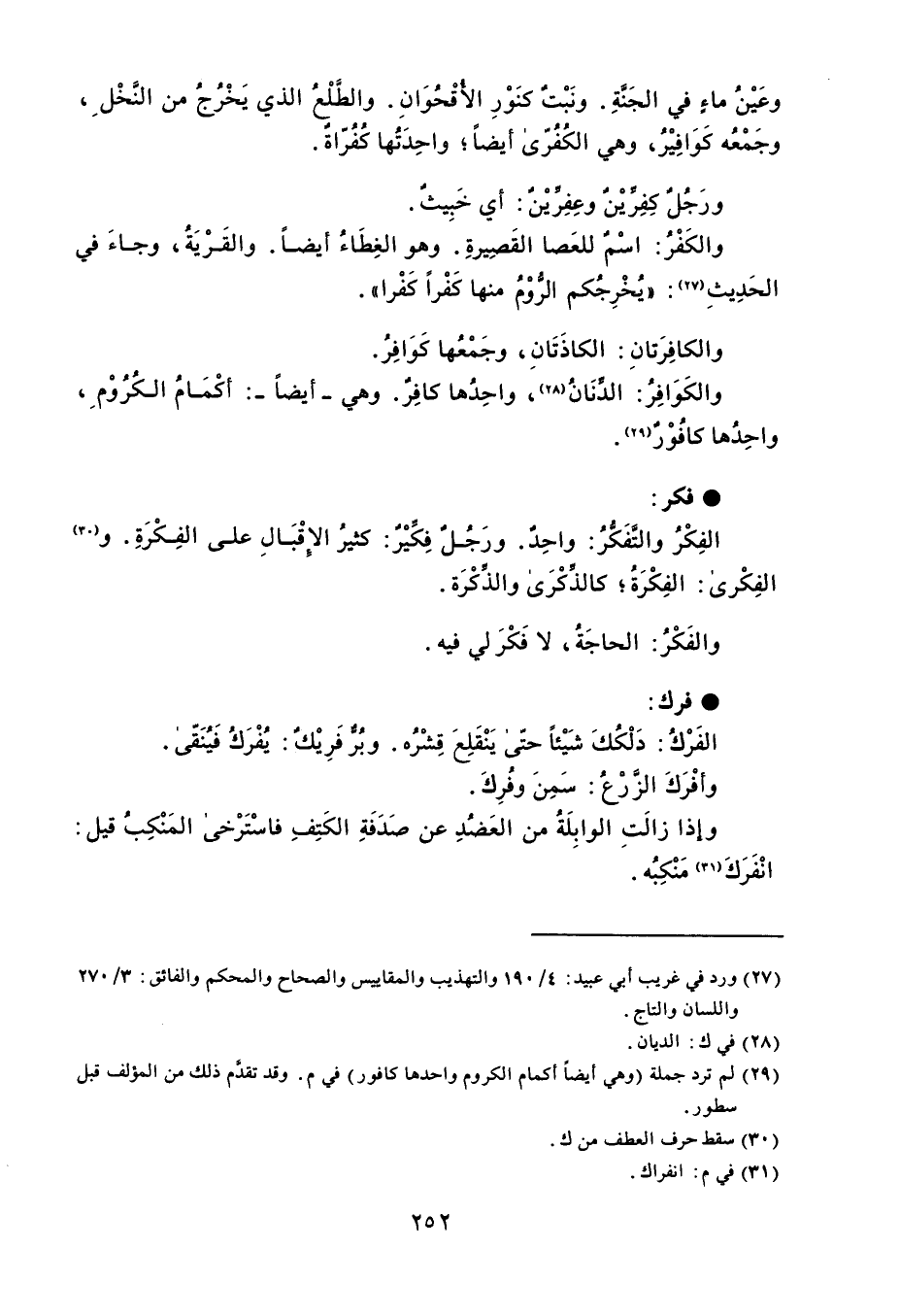 وعَيْنُ ماءٍ في الجَنَّةِ . ونَبْتٌ كنَوْرِ الأُقْحُوَانِ . والطَّلْعُ الذي يَخْرُجُ من النَّخْل ، وجَمْعُه كَوَافِيْرُ ، وهي الكُفُرّى أيضاً واحِدَتُها كفُرّاة . ورَجُلٌ كِفِريْنٌ وعِفِرِّيْنٌ : أي خَبِيثٌ . والكَفْرُ : اسْمٌ للعَصا القَصِيرةِ . وهو الغِطَاءُ أيضاً . والقَرْيَة ، وجاءَ في الحَدِيثِ : ' يُخْرِجُكم الروْمُ منها كَفْراً كَفْرا ' . والكافِرَتانِ : الكاذَتَانِ ، وجَمْعُها كَوَافِرُ . والكَوَافِرُ : الدَّنَانُ ، واحِدُها كافِر . وهي - أيضاً - : أكْمَامُ الكُرُوْم ، واحِدُها كافُوْرٌ . ؟ فكر الفِكْرُ والتَفَكُرُ : واحِدٌ . ورَجُلٌ فِكَيْرٌ : كثيرُ الإِقْبَالِ على الفِكْرَةِ . والفِكْرى : الفِكْرَةُ كالذِّكْرَى والذِّكْرَة . والفَكْرُ : الحاجَةُ ، لا فَكْرَ لي فيه . فرك الفَرْكُ : دَلْكُكَ شَيْئاً حتّى يَنْقَلِعَ قِشْرُه . وبُرٌّ فَرِيكٌ : يُفْرَكُ فَيُنَقّى . وأفْرَكَ الزَّرْعُ : سَمِنَ وفُرِكَ . وإذا زالَتِ الوابِلَةُ من العَضُدِ عن صَدَفَةِ الكَتِفِ فاسْتَرْخى المَنْكِبُ قيل : انْفَرَكَ مَنْكِبُه .