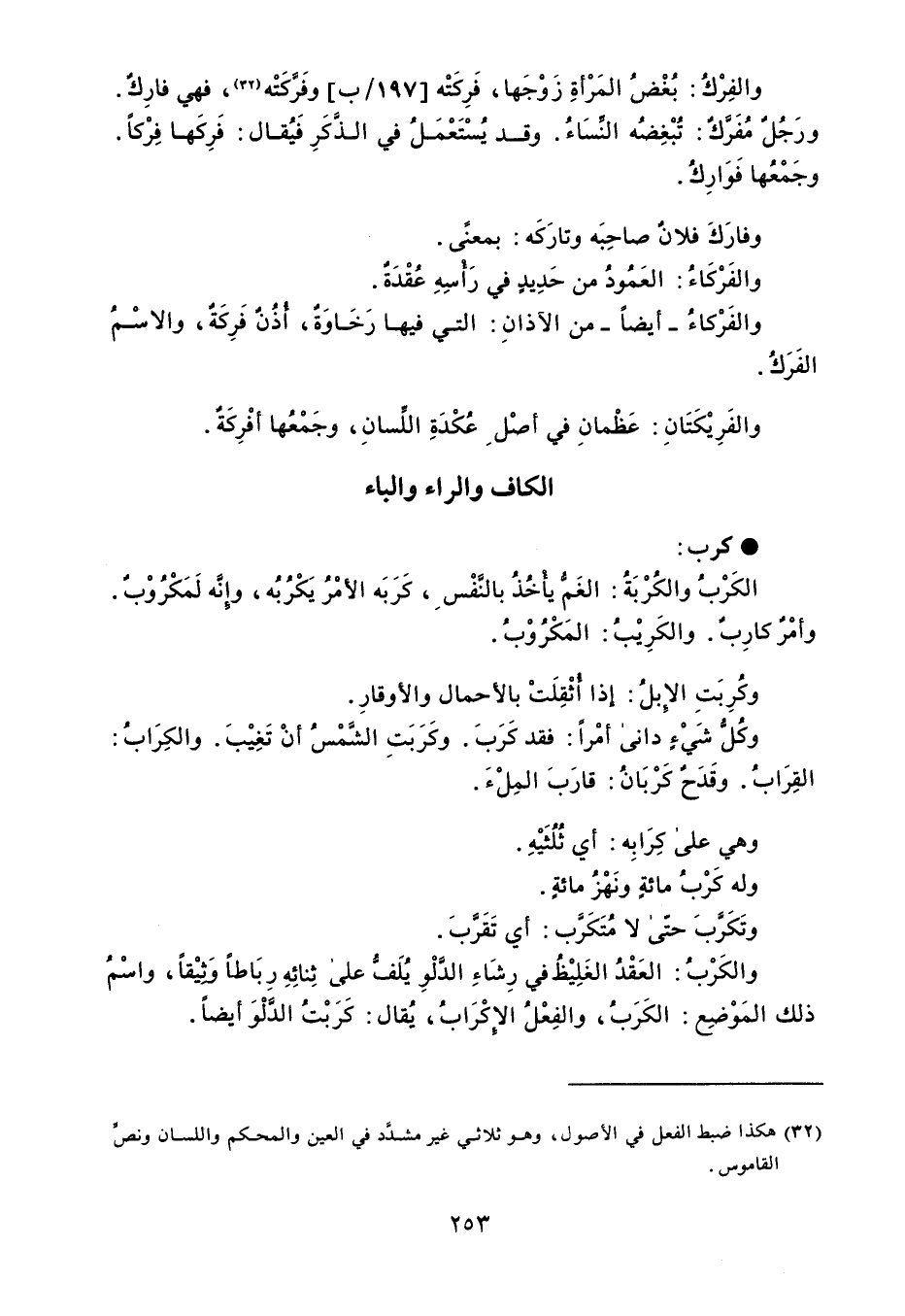 كرب الكَرْبُ والكُرْبَةُ : الغم يأْخُذُ بالنَّفْس ، كَرَبَه الأمْرُ يَكْرُبُه ، وإِنَّه لَمَكْرُوْبٌ . وأمْرٌ كارِبٌ . والكَرِيْبُ : المَكْرُوْبُ . وكُرِبَتِ الإِبلُ : إذا أُثْقِلَتْ بالأحمال والأوقارِ . وكُلُّ شَيْءٍ دانى أمْراً : فقد كَرَبَ . وكَرَبَتِ الشَّمْسُ أنْ تَغِيْبَ . والكِرَابُ : القِرَابُ . وقَدَحٌ كَرْبَانُ : قارَبَ المِلْءَ . وهي على كِرَابِه : أي ثُلُثَيْهِ . وله كَرْبُ مائةٍ ونَهْزُ مائةٍ . وتَكَربَ حتّى لا مُتَكَرب : أي تَقَرَّبَ . والكَرْبُ : العَقْدُ الغَلِيْظُ في رِشَاءِ الدَّلْوِ يُلَفُّ على ثِنائِهِ رِبَاطاً وَثيْقاً ، واسْمُ ذلك المَوْضِع : الكَرَبُ ، والفِعْلُ الإِكْرَابُ ، يُقال : كَرَبْتُ الدَّلْوَ أيضاً .