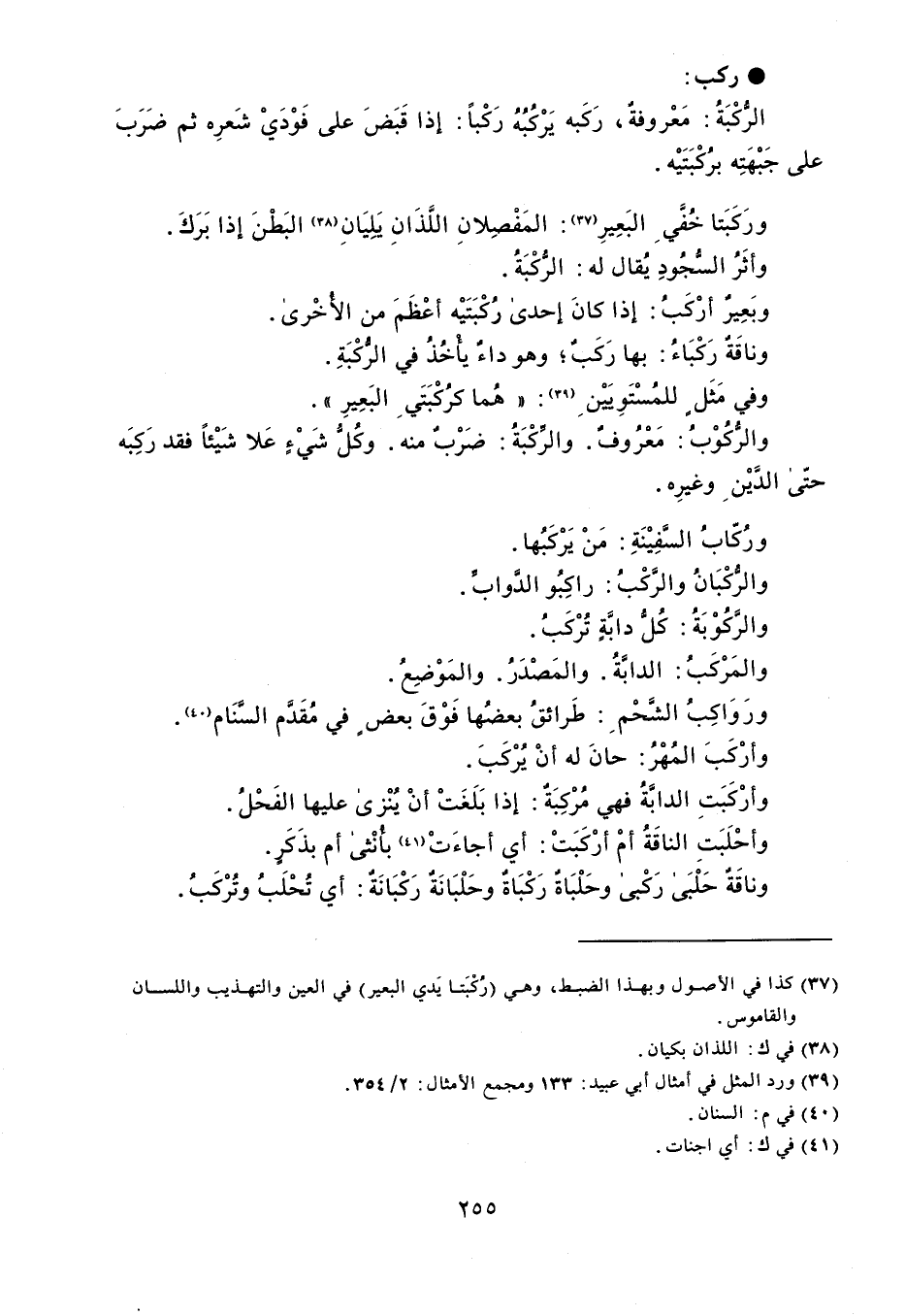 ركب الرُّكْبَةُ : مَعْروفةٌ ، رَكَبه يَرْكُبُه رَكْباً : إذا قَبَضَ على فَوْدَيْ شَعرِه ثم ضَرَبَ على جَبْهَتِه برُكْبَتَيْه . ورَكَبَتا خُفي البَعِيرِ : المَفْصِلانِ اللَّذَانِ يَلِيَانِ البَطْنَ إذا بَرَكَ . وأثَرُ السُّجُودِ يُقال له : الرُّكْبَةُ . وبَعِيرٌ أرْكَبُ : إذا كانَ إحدى رُكْبَتَيْه أعْظَمَ من الأُخْرى . وناقَةٌ رَكْبَاءُ : بها رَكَبٌ وهو داءٌ يأْخُذُ في الرُّكْبَةِ . وفي مَثَل للمُسْتَوِيَيْن : ' هُما كرُكْبَتَي البَعِيرِ ' . والرُّكُوْبُ : مَعْرُوفٌ . والركْبَةُ : ضَرْبٌ منه . وكُل شَيْءٍ عَلا شَيْئاً فقد رَكِبَه حتّى الدَّيْنَ وغيرِه . ورُكّابُ السَّفِيْنَةِ : مَنْ يَرْكَبُها . والرُّكْبَانُ والرَّكْبُ : راكِبُو الدَّوابِّ . والرَّكُوْبَةُ : كُل دابَّةٍ تُرْكَبُ . والمَرْكَبُ : الدابَّةُ . والمَصدَرُ . والمَوْضِعُ . ورَوَاكِبُ الشَّحْم : طَرائقُ بعضُها فَوْقَ بعض في مُقَدَّم السَّنَام . وأرْكَبَ المُهْرُ : حانَ له أنْ يُرْكَبَ . وأرْكَبَتِ الدابَّةُ فهي مُرْكِبَة : إذا بَلَغَتْ أنْ يُنْزى عليها الفَحْلُ . وأحْلَبَتِ الناقَةُ أمْ أرْكَبَتْ : أي أجاءَتْ بأُنْثى أم بذَكَرٍ . وناقَةٌ حَلْبَى رَكْبى وحَلْبَاةٌ رَكْبَاةٌ وحَلْبَانَةٌ رَكْبَانَةٌ : أي تُحْلَبُ وتُرْكَبُ .
