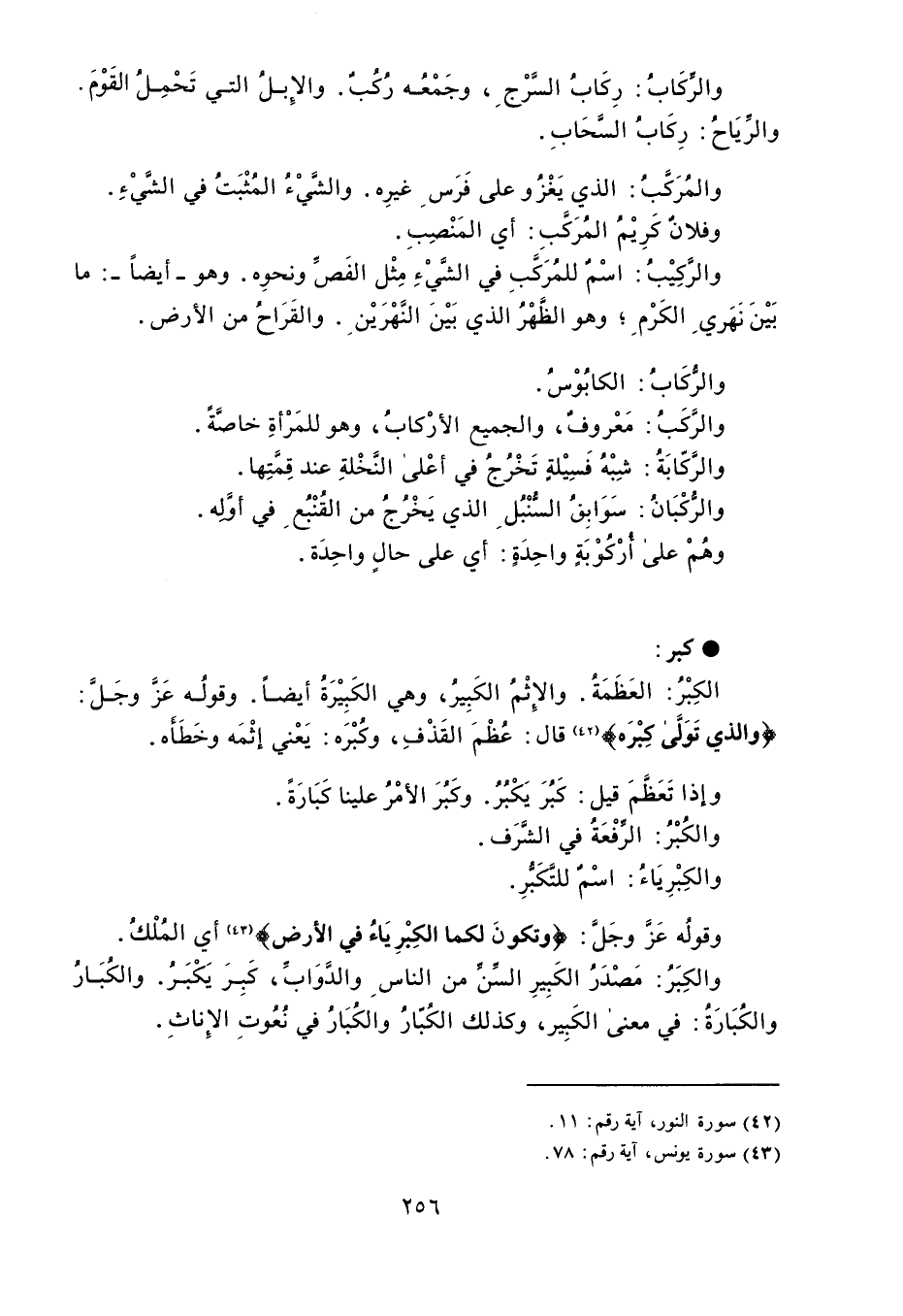 والرِّكَابُ : رِكَابُ السَّرْجِ ، وجَمْعُه رُكُبٌ . والإِبلُ التي تَحْمِلُ القَوْمَ . والرِّيَاحُ : رِكَابُ السَّحَابِ . والمُرَكَّبُ : الذي يَغْزُو على فَرَس غيرِه . والشَّيْءُ المُثْبَتُ في الشَّيْءِ . وفلانٌ كَرِيْمُ المُرَكَّبِ : أي المَنْصبِ . والرَّكِيْبُ : اسْمٌ للمُرَكَبِ في الشَّيْءِ مِثْل الفَصِّ ونحوِه . وهوه - أيضاً - : ما بَيْنَ نَهَري الكَرْم وهو الظَّهْرُ الذي بَيْنَ النَّهْرَيْن . والقَرَاحُ من الأرض . والرُّكَابُ : الكابُوْسُ . والرَّكَبُ : مَعْروفٌ ، والجميع الأرْكابُ ، وهو للمَرْأةِ خاصَّةً . والرَّكّابَةُ : شِبْهُ فَسِيْلةٍ تَخْرُجُ في أعْلى النَّخْلةِ عند قِمَتِها . والرُّكْبَانُ : سَوَابِقُ السُّنْبُل الذي يَخْرُجُ من القُنْبُع في أوِّله . وهُمْ على أُرْكُوْبَةٍ واحِدَةٍ : أي على حالٍ واحِدَة . كبر الكِبْرُ : العَظَمَةُ . والإِثْمُ الكَبِير ، وهي الكَبِيْرَةُ أيضاً . وقولُه عَزَّ وجَلَّ : ' والذي تَوَلَّى كِبْرَه ' قال : عُظْمَ القَذْفِ ، وكُبْرَه : يَعْني إثْمَه وخَطَأَه . وإذا تَعَظَّمَ قيل : كَبُرَ يَكْبُرُ . وكَبُرَ الأمْرُ علينا كَبَارَةً . والكُبْرُ : الرفْعَةُ في الشَّرَف . والكِبْرِيَاءُ : اسْمٌ للتَّكَبُّرِ . وقولُه عَز وجَلَّ : ' وتكونَ لكما الكِبْرِيَاءُ في الأرض ' . أي المُلْكُ . والكِبَرُ : مَصدَْرُ الكَبِيرِ السِّنِّ من الناس والدَّوَابِّ ، كَبِرَ يَكْبَرُ . والكُبَارُ والكُبَارَة : في معنى الكَبِير ، وكذلك الكُبّارُ والكُبَارُ في نُعُوتِ الإِناثِ .