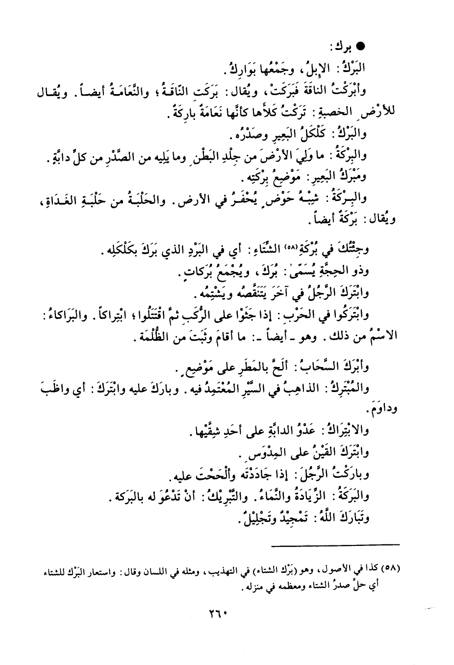 برك البَرْكُ : الإِبل ، وجَمْعُها بَوَارِكُ . وأبْرَكْتُ الناقَةَ فَبَرَكَتْ ، ويُقال : بَرَكَتِ النّاقَةُ والنَّعَامَةُ أيضاً . ويُقال للأرْض الخصبةِ : تَرَكْتُ كَلأها كأنَّها نَعَامَةٌ بارِكَةٌ . والبَرْكُ : كَلْكَلُ البَعِيرِ وصَدْرُه . والبِرْكَةُ : ما وَليَ الأرْضَ من جِلْدِ البَطْن وما يَليه من الصَّدْرِ من كل دابَّةٍ . ومَبْرَكُ البَعِيرِ : مَوْضِعُ بِرْكَتِه . والبِرْكَةُ : شِبْهُ حَوْض يُحْفَرُ في الأرض . والحَلْبَةُ من حَلْبَةِ الغَدَاةِ ، ويُقال : بَرْكَةٌ أيضاً . وجِئْتُكَ في بُرْكَةِ الشِّتَاءِ : أي في البَرْدِ الذي بَرَكَ بكَلْكَلِه . وذو الحِجَّةِ يُسَمّى : بُرَكَ ، ويُجْمَعُ بُرَكاتٍ . وابْتَرَكَ الرَّجُلُ في آخَرَ يَتَنَقَصُه ويَشْتِمُه . وابْتَرَكُوا في الحَرْبِ : إذا جَثَوْا على الركَبِ ثمَّ اقْتَتَلُوا ابْتِراكاً . والبَرَاكاءُ : الاسْمُ من ذلك . وهو - أيضاً - : ما أقامَ وثَبَتَ من الظُلْمَة . وأبْرَكَ السَّحَابُ : ألحَّ بالمَطَرِ على مَوْضِعٍ . والمُبْتَرِكُ : الذاهِبُ في السَّيْرِ المُعْتَمِدُ فيه . وبارَكَ عليه وابْتَرَكَ : أي واظَبَ وداوَمَ . والابتِرَاكُ : عَدْوُ الدابَّةِ على أحَدِ شِقَّيْها . وابْتَرَكَ القَيْنُ على المِدْوَس . وبارَكْتُ الرَّجُلَ : إذا جَادَدْتَه وألْحَحْتَ عليه . والبَرَكَةُ : الزيَادَةُ والنَّمَاءُ . والتَبْرِيْكُ : أنْ تَدْعُوَ له بالبَرَكة . وتَبَارَكَ اللَّهُ : تَمْجِيْدٌ وتَجْلِيْلٌ .