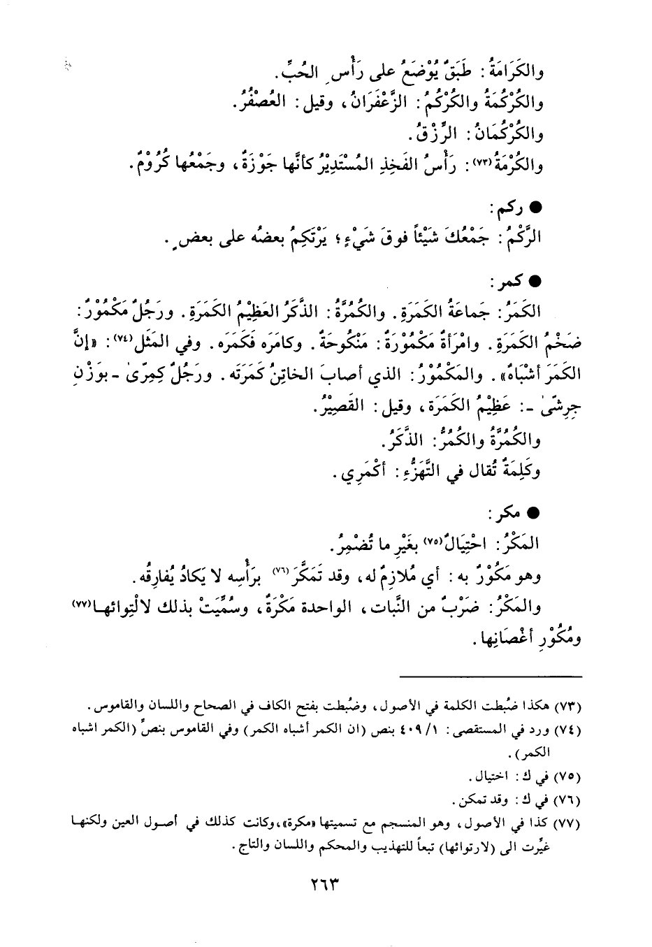 والكَرَامَة : طَبَقٌ يُوْضعُ على رَأسِ الحُبِّ . والكُرْكُمَةُ والكُرْكُمُ : الزَّعْفَرَانُ ، وقيل : العُصْفرُ . والكُرْكُمَانُ : الرِّزْقُ . والكُرْمَةُ : رَأسُ الفَخِذِ المُسْتَدِيْرُ كأنَها جَوْزَةٌ ، وجَمْعُها كُرُوْمٌ . ركم الرَّكْمُ : جَمْعُكَ شَيْئاً فوقَ شَيْءٍ يَرْتَكِمُ بعضُه على بعض . كمر الكَمَرُ : جَماعَةُ الكَمَرَةِ . والكُمُرّة : الذَّكَرُ العَظِيْمُ الكَمَرَةِ . ورَجُلٌ مَكْمُوْرٌ : ضَخْمُ الكَمَرَةِ . وامْرَأةٌ مَكْمُوْرَةٌ : مَنْكُوحَةٌ . وكامَرَه فَكَمَرَه . وفي المَثَل : ' إنَّ الكَمَرَ أشْبَاهٌ ' . والمَكْمُوْرُ : الذي أصابَ الخاتِنُ كَمَرَتَه . ورَجُلٌ كِمِرّى بوَزْنِ جِرِشّى - : عَظِيْمُ الكَمَرَة ، وقيل : القَصِيْرُ . والكُمُرَّة والكُمُرُّ : الذَّكَرُ . وكَلِمَةٌ تُقال في التَّهزُّءِ : أكْمَرِي . مكر المَكْرُ : احْتِيَالٌ بغَيْرِ ما تُضْمِرُ . وهو مَكُوْرٌ به : أي مُلازِمٌ له ، وقد تَمَكَّرَ برأسه لا يَكادُ يُفارِقُه . والمَكْرُ : ضَرْبٌ من النَّبات ، الواحدة مَكْرَةٌ ، وسُمِّيَتْ بذلك لالْتِوائها ومُكُوْرِ أغْصَانِها .